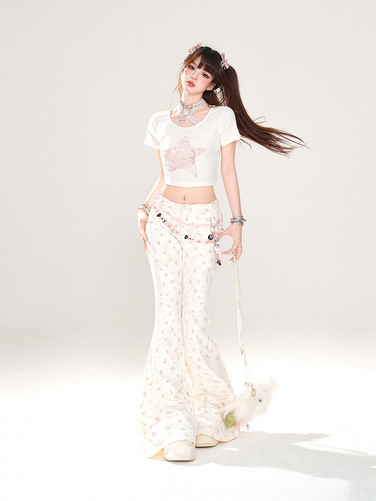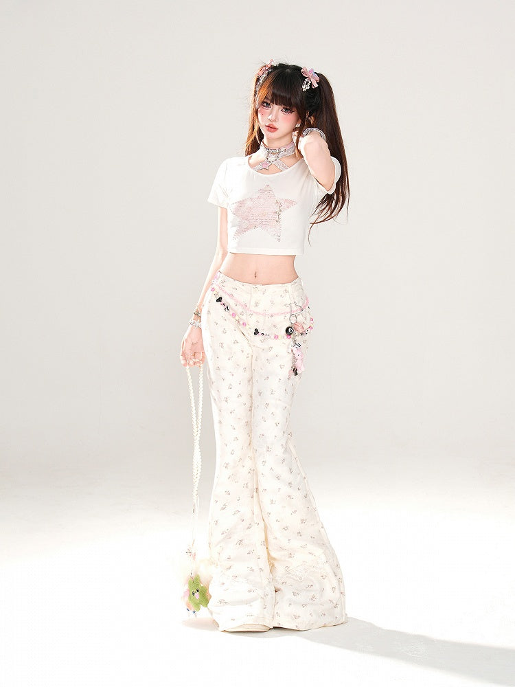 Diese bezaubernde Apricot-Hose mit niedriger Taille besticht durch ein wunderschönes Blumenmuster und ein schmal geschnittenes Design mit ausgestelltem Saum. Perfekt, um Ihrer Garderobe einen Hauch von Charme zu verleihen.