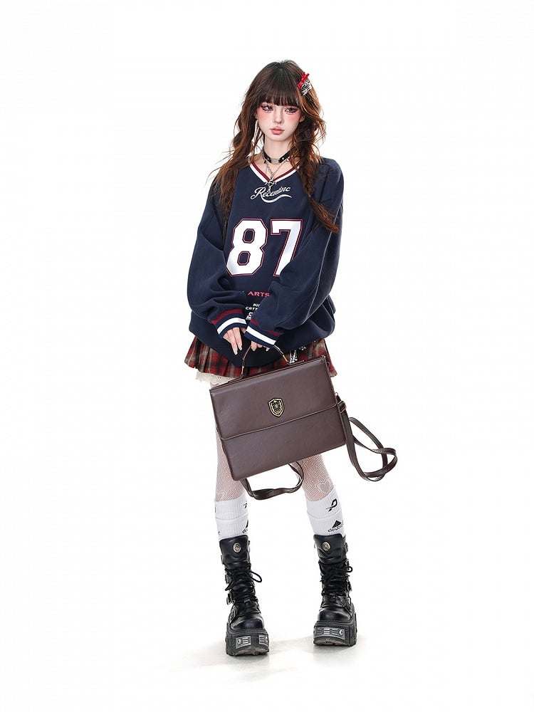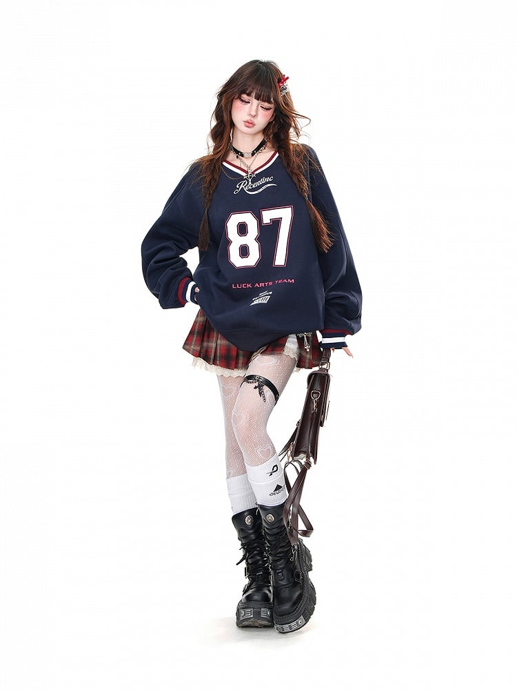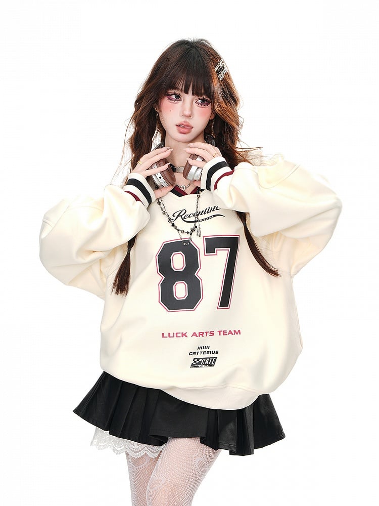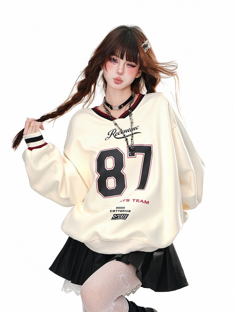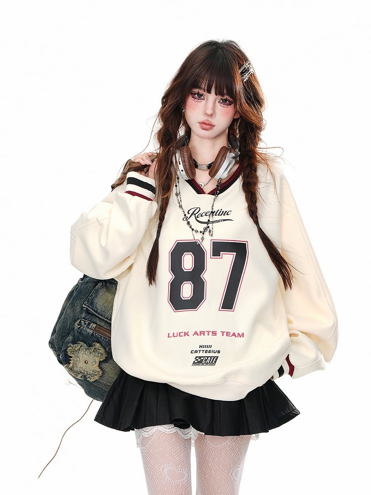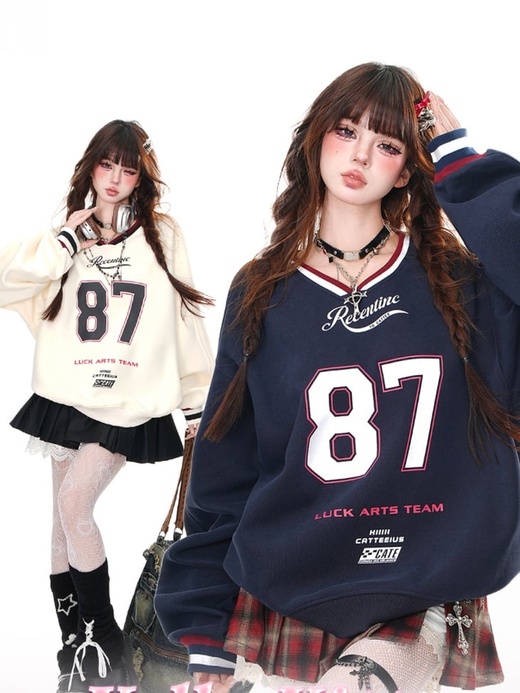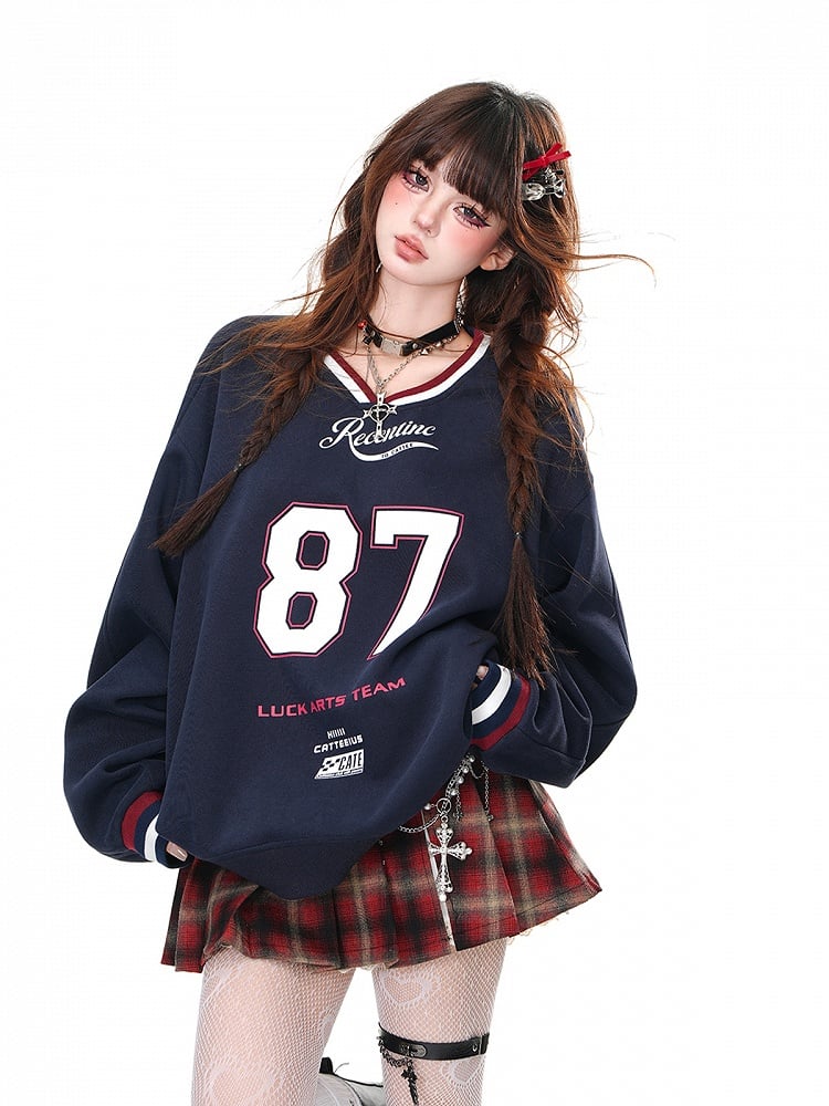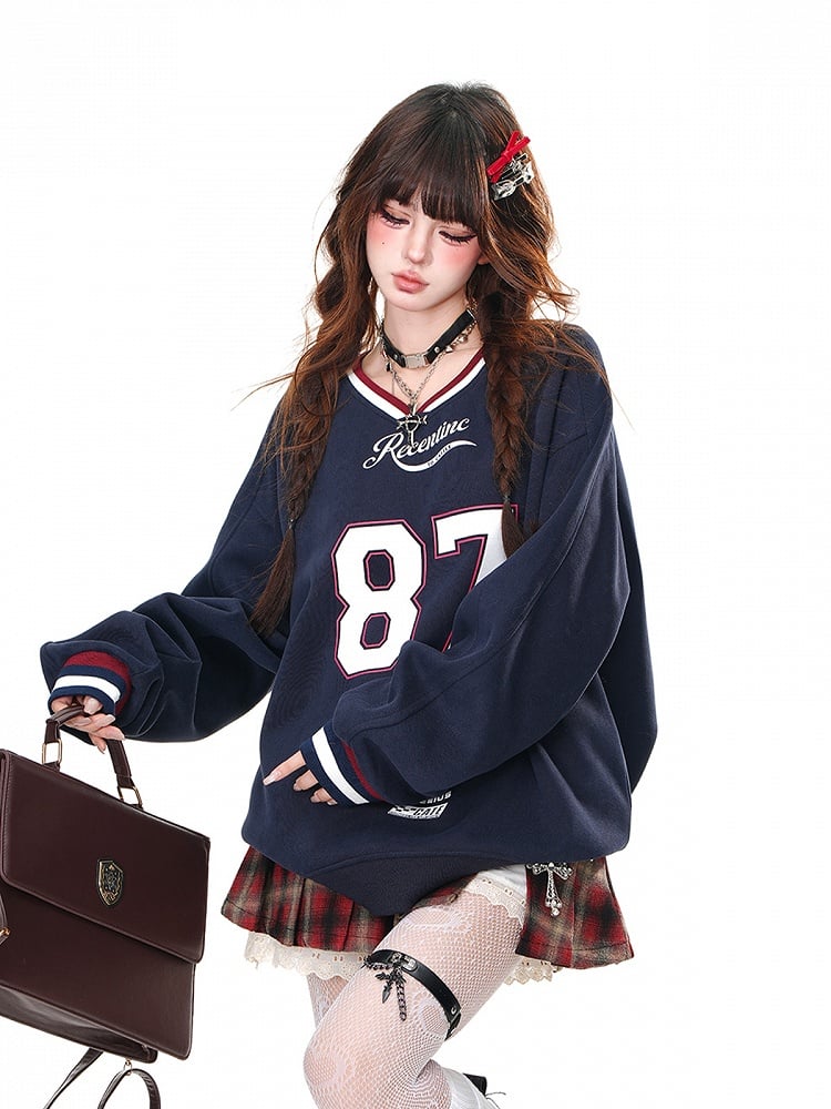 Aprikosen-/Marineblaues, lockeres Sweatshirt mit V-Ausschnitt und Zahlendruck in Bittersüß