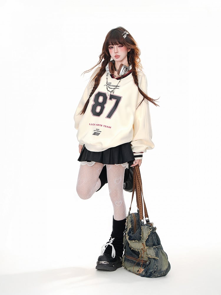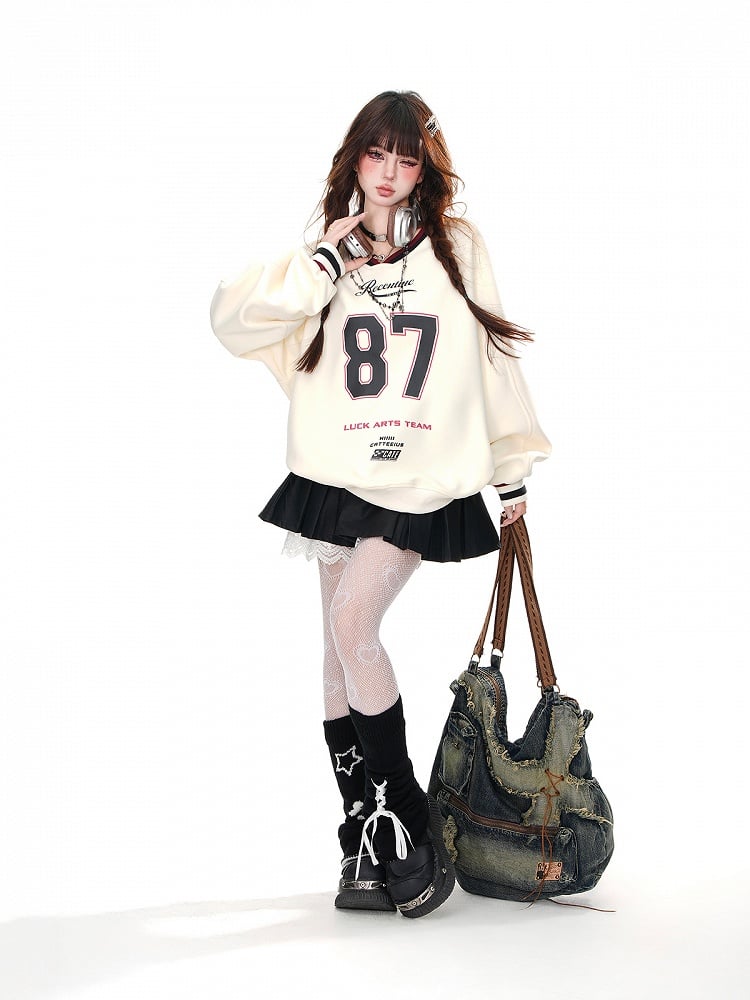 Machen Sie es sich gemütlich und süß in diesem apricot-/marineblauen, lockeren Sweatshirt mit V-Ausschnitt und Zahlendruck. Mit seiner entspannten Passform, dem V-Ausschnitt und dem einzigartigen Zahlendruck-Design bleiben Sie den ganzen Tag über stilvoll und bequem. Perfekt für jeden lässigen Anlass, verleiht dieses Sweatshirt Ihrer Garderobe einen Hauch von Charme.