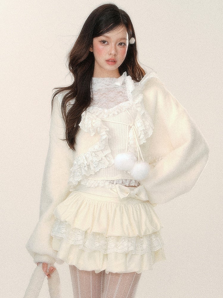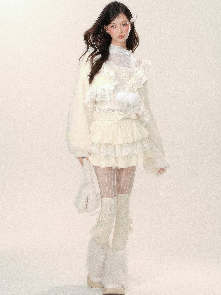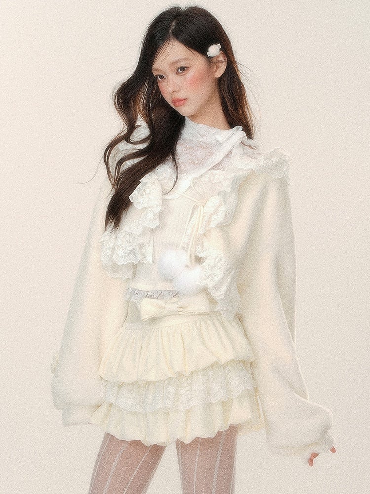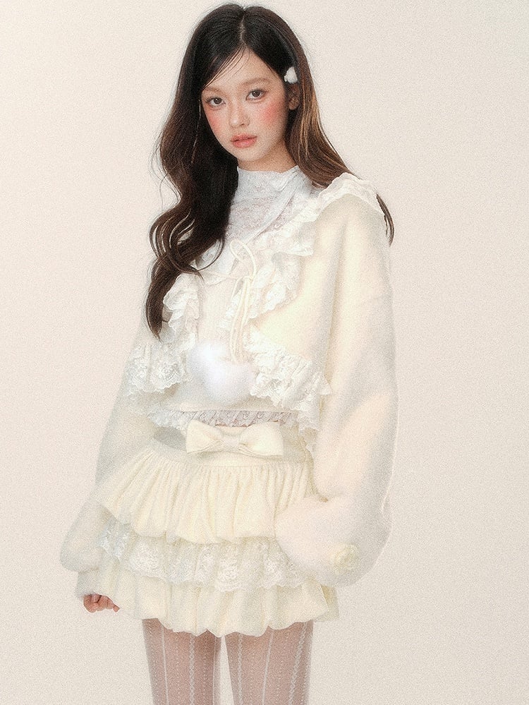 Süße, apricotfarbene, kurze Strickjacke mit selbstbindenden Trägern und zartem Spitzenbesatz. Aus weichem Plüschmaterial gefertigt, verleiht sie jedem Outfit einen Hauch von Wärme und Stil. Bleiben Sie gemütlich und modisch mit dieser schönen Strickjacke.