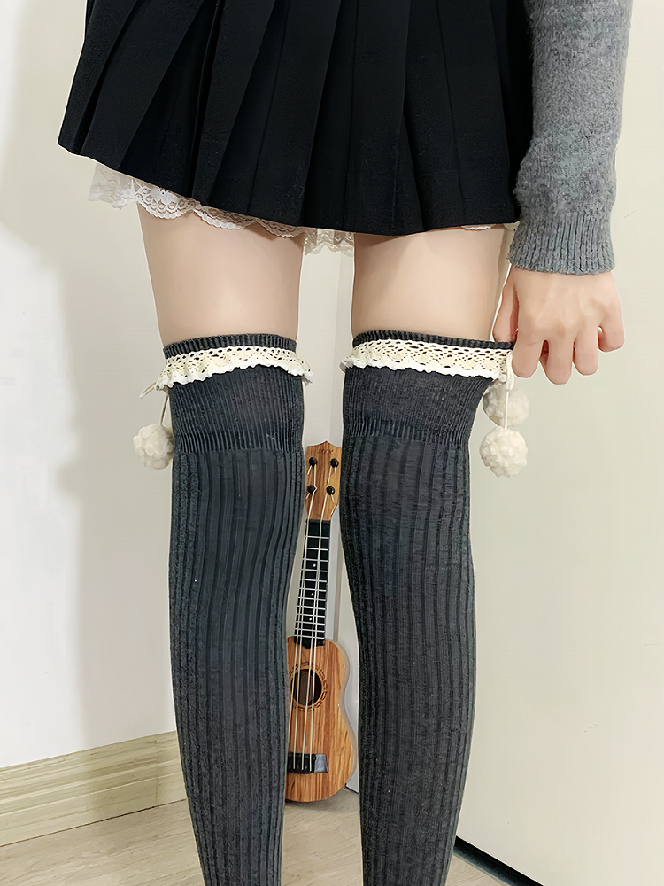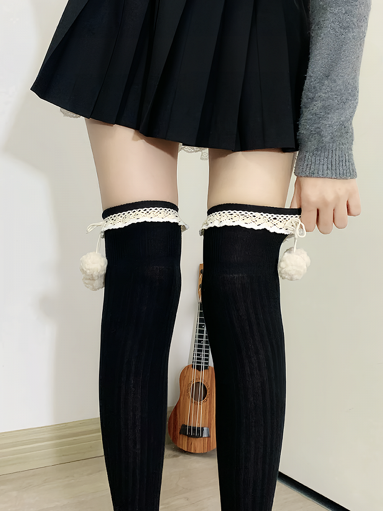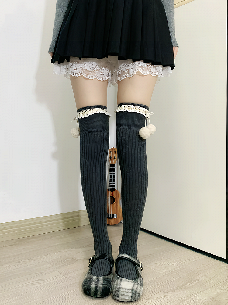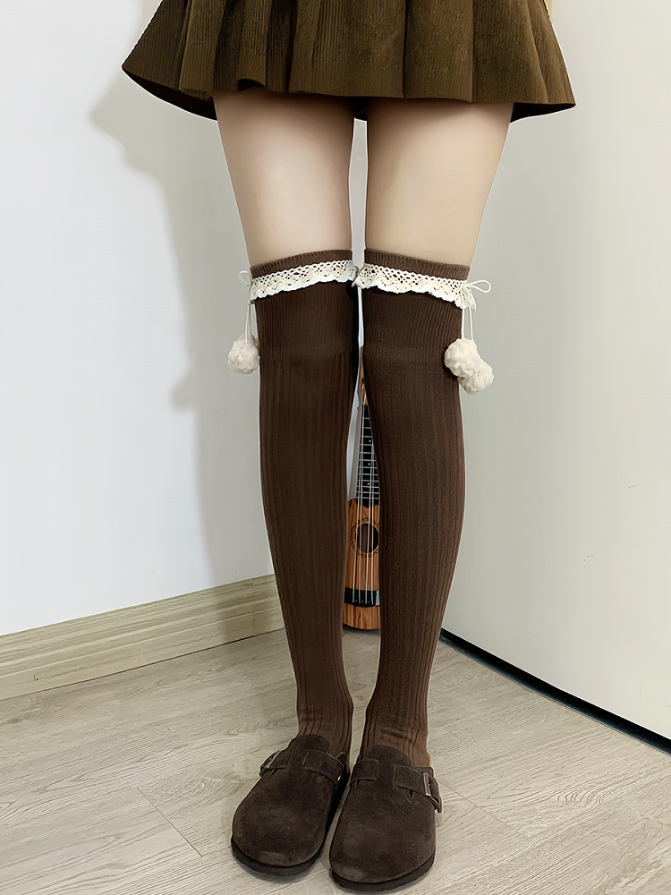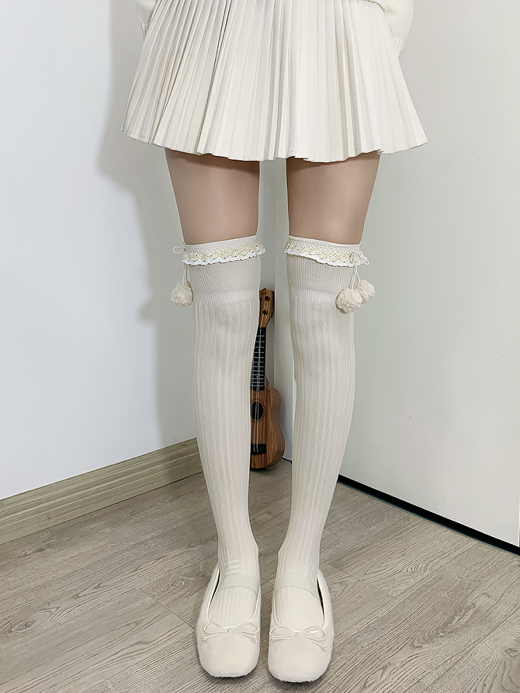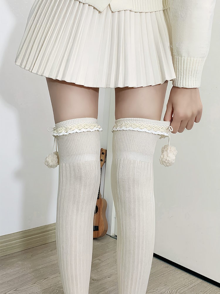 Hüllen Sie Ihre Beine in diese bezaubernden Overknee-Strümpfe. Hergestellt aus weichem apricotfarbenem Stoff mit süßen Rüschenbündchen, sind diese Strümpfe mit hübschen Pompons verziert, die für einen Hauch von Charme sorgen. Perfekt, um jedem Outfit eine süße und verspielte Note zu verleihen.