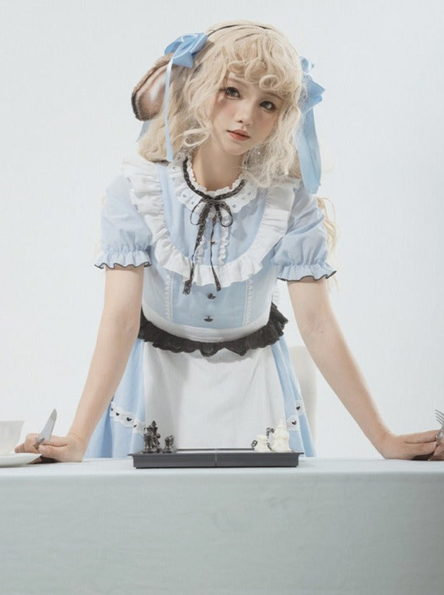 Blau-weißes Old School Lolita Fashion Kleid mit Schleife und Details, JSK-Set