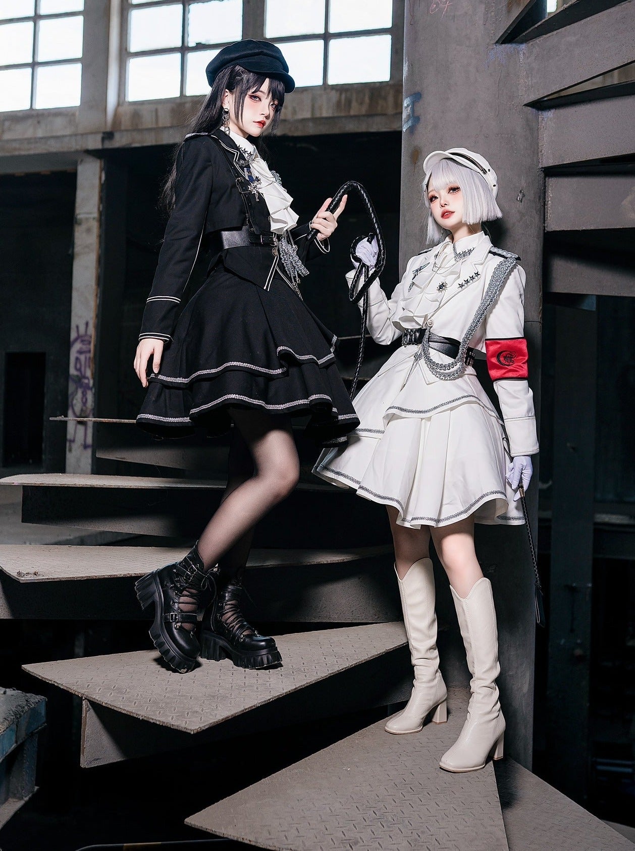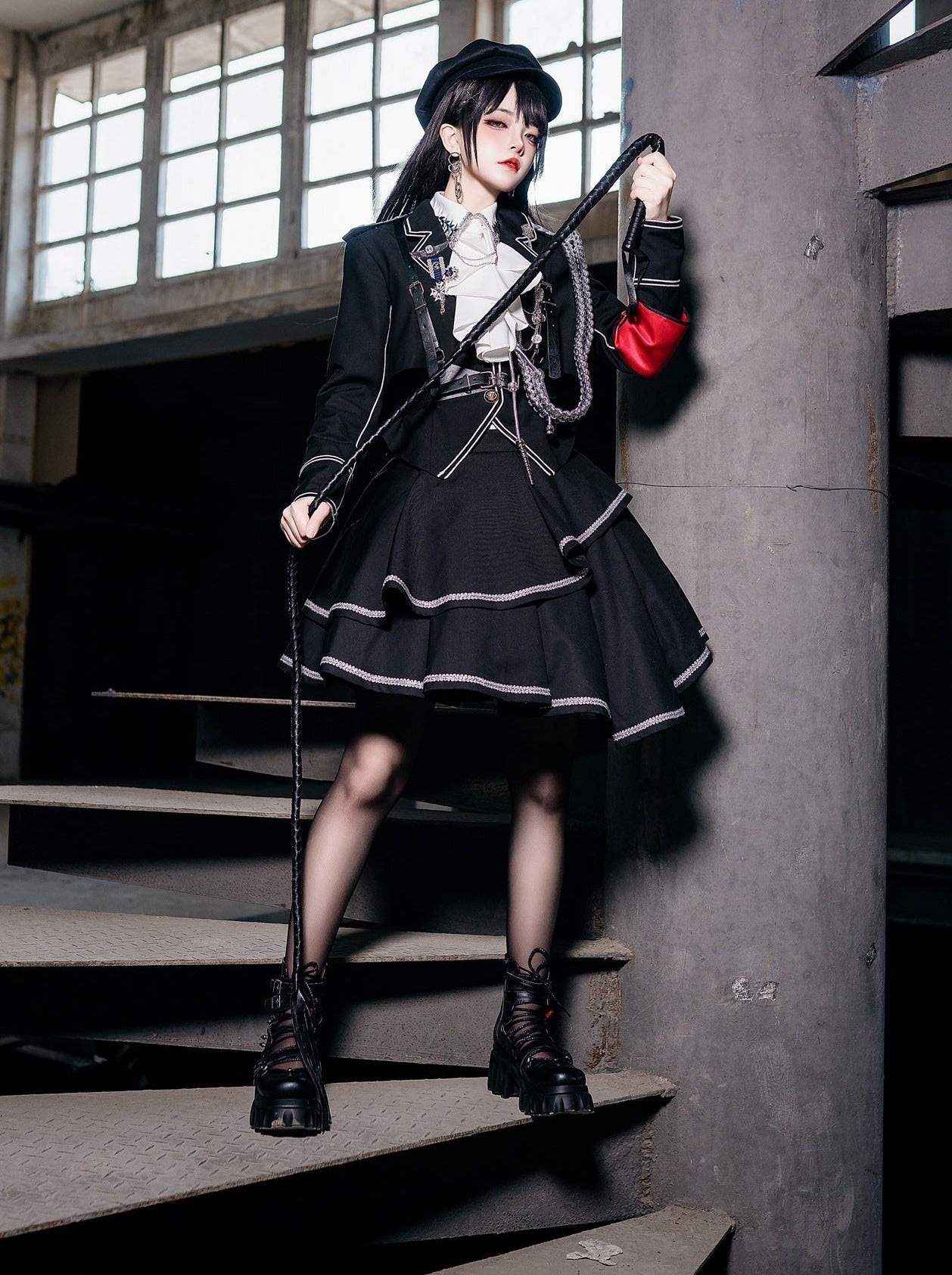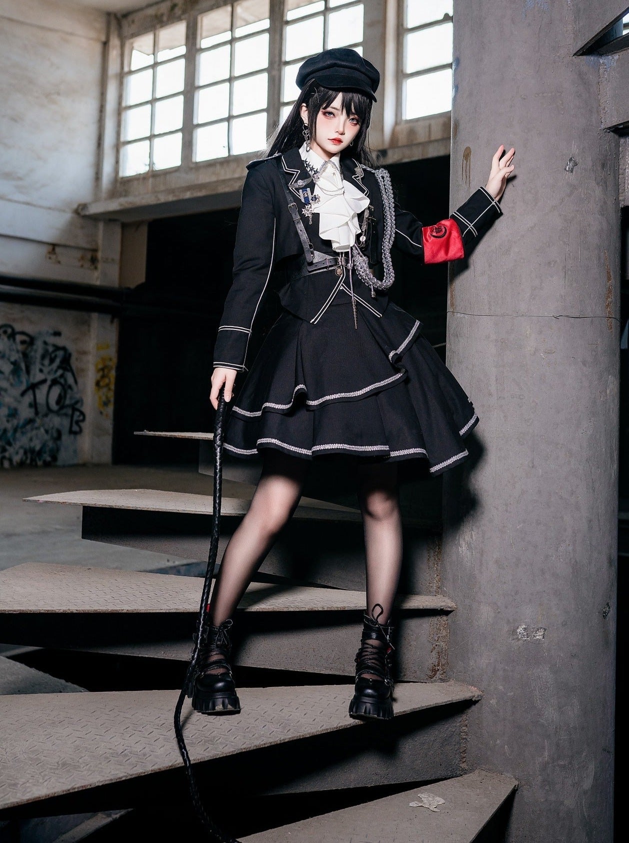 Erobern Sie die Modewelt mit unserem dunklen Army-Rock! Dieser asymmetrische Militärrock passt perfekt zu Uniformhemd und Mantel und sorgt für einen süßen und selbstbewussten Look. Zeigen Sie Stil und Stärke mit diesem bezaubernden Ensemble.