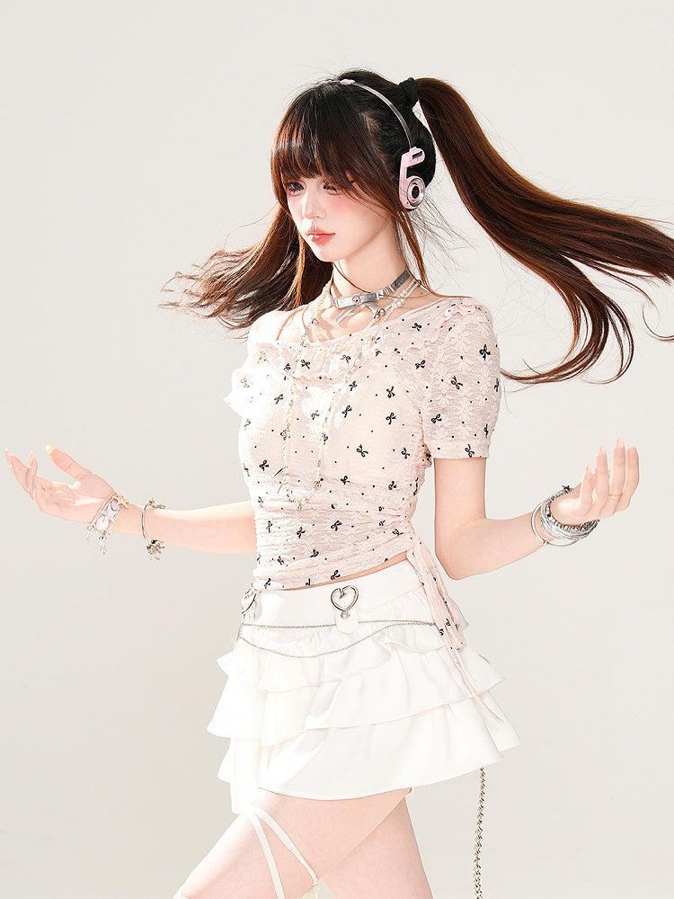 Asymmetrischer Ausschnitt Schleifendruck Kordelzug Halbtransparentes T-Shirt Rosa Taille