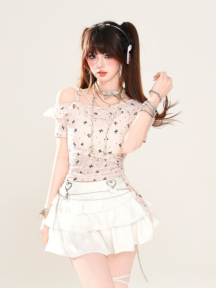 Asymmetrischer Ausschnitt, Schleifendruck, Kordelzug in der Taille, rosa, halbtransparentes T-Shirt