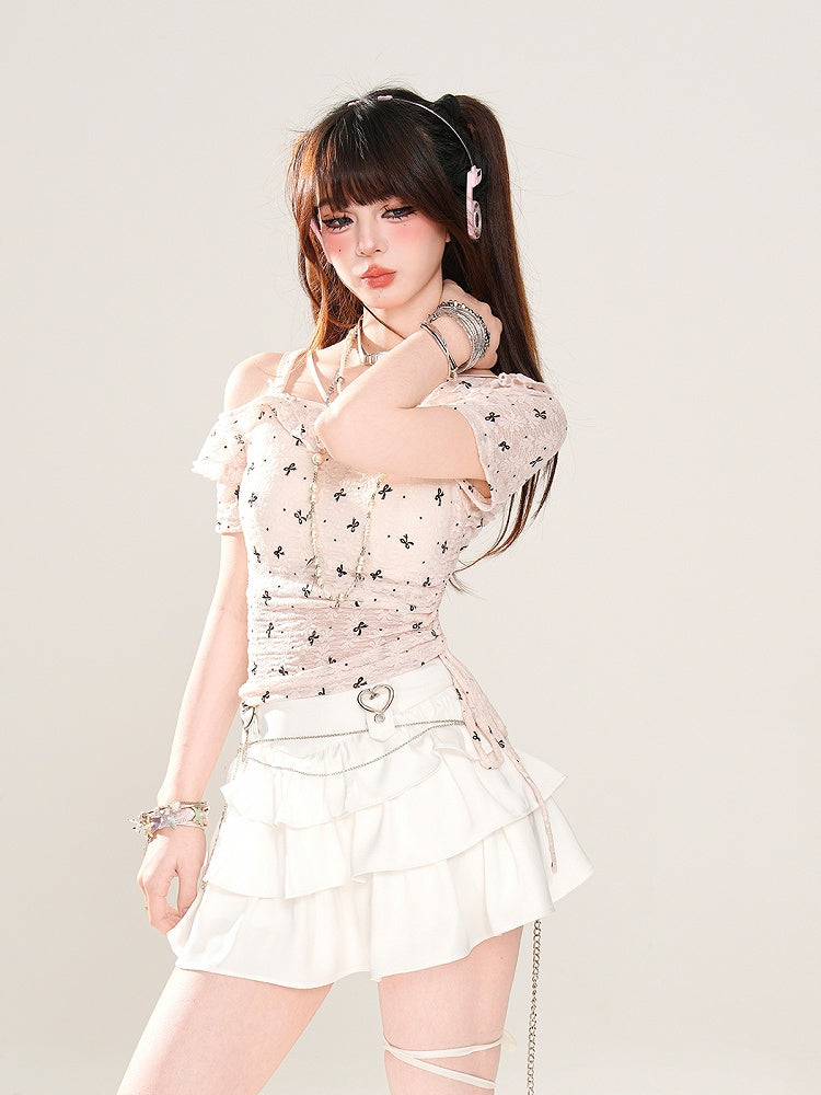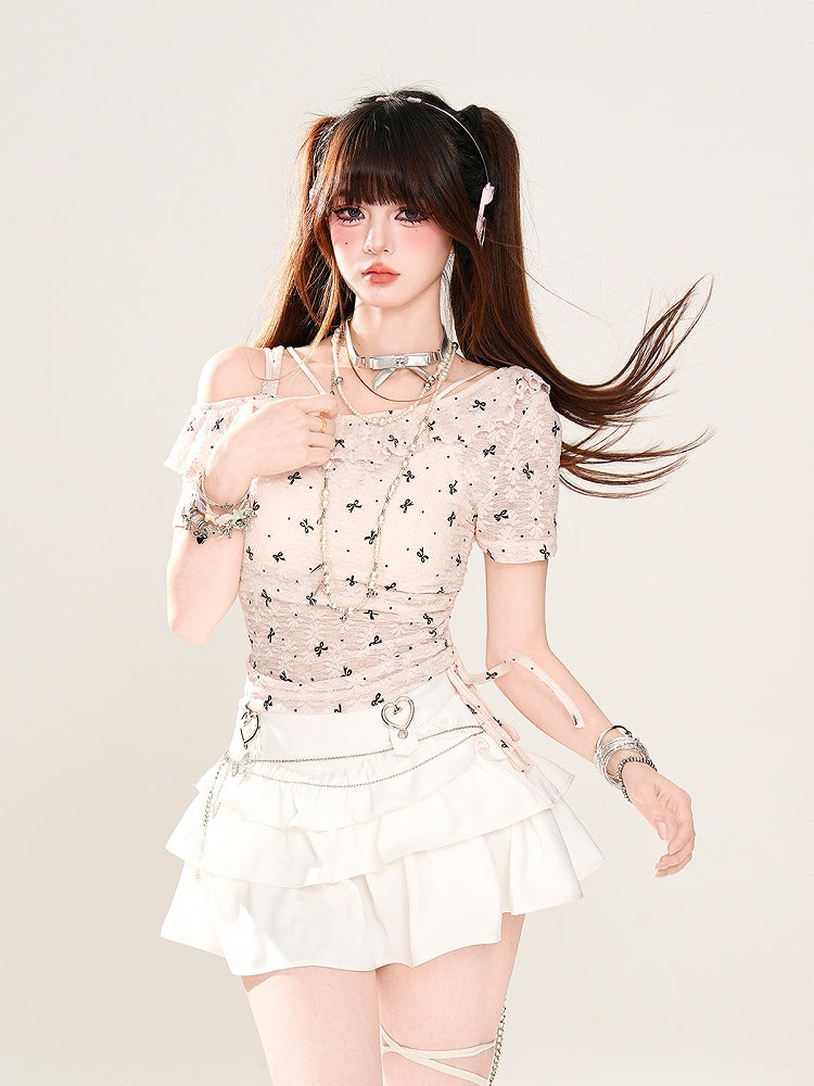 ● Schleifendetails / Ausgeschnittene Schulter / Kordelzug in der Taille / Halbtransparent