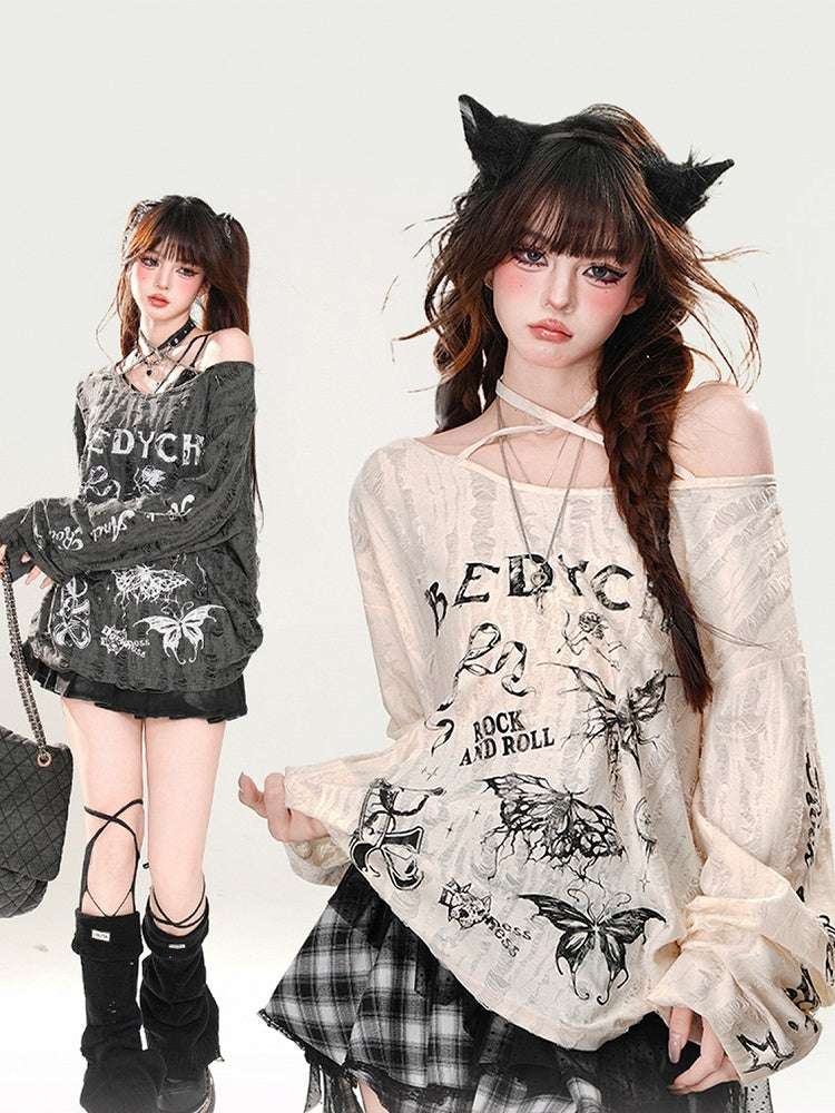 Asymmetrischer Ausschnitt, Schmetterlingsdruck, Distressed-Löcher, Aprikose/Grau, Neckholder-Top
