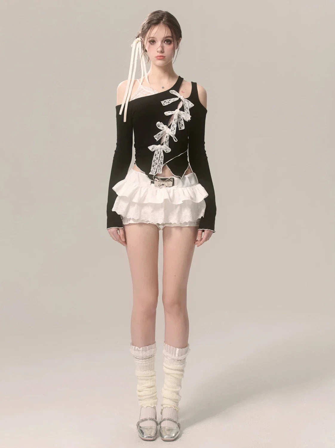Asymmetrisches Top Off-Shoulder Faux Ribbon Lace Schwarz Zweiteiler