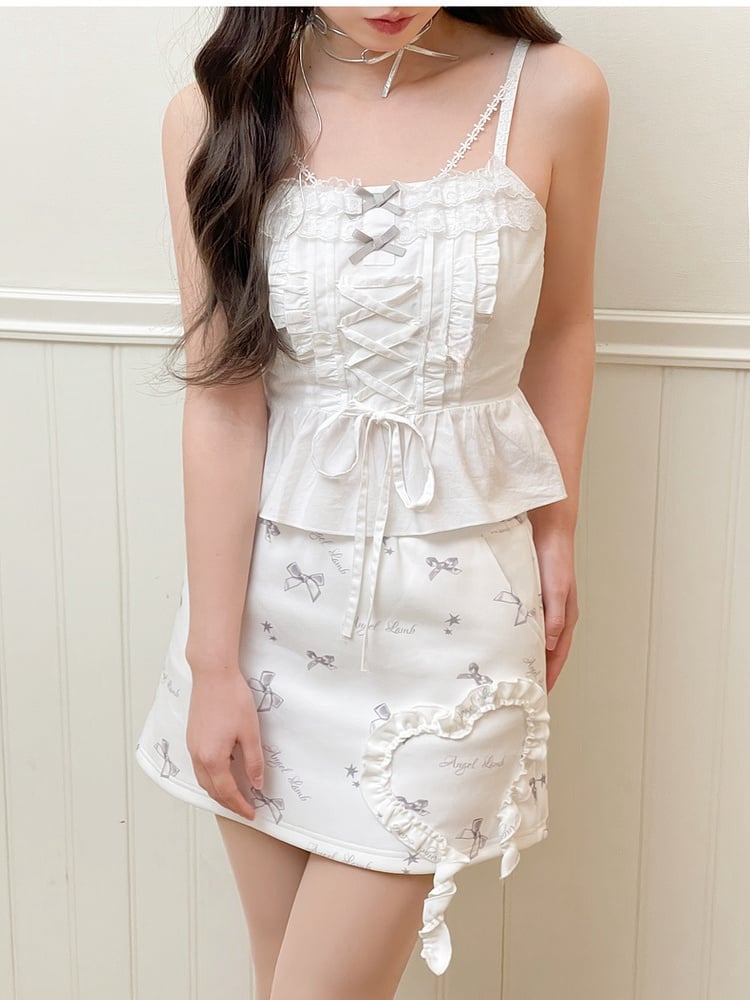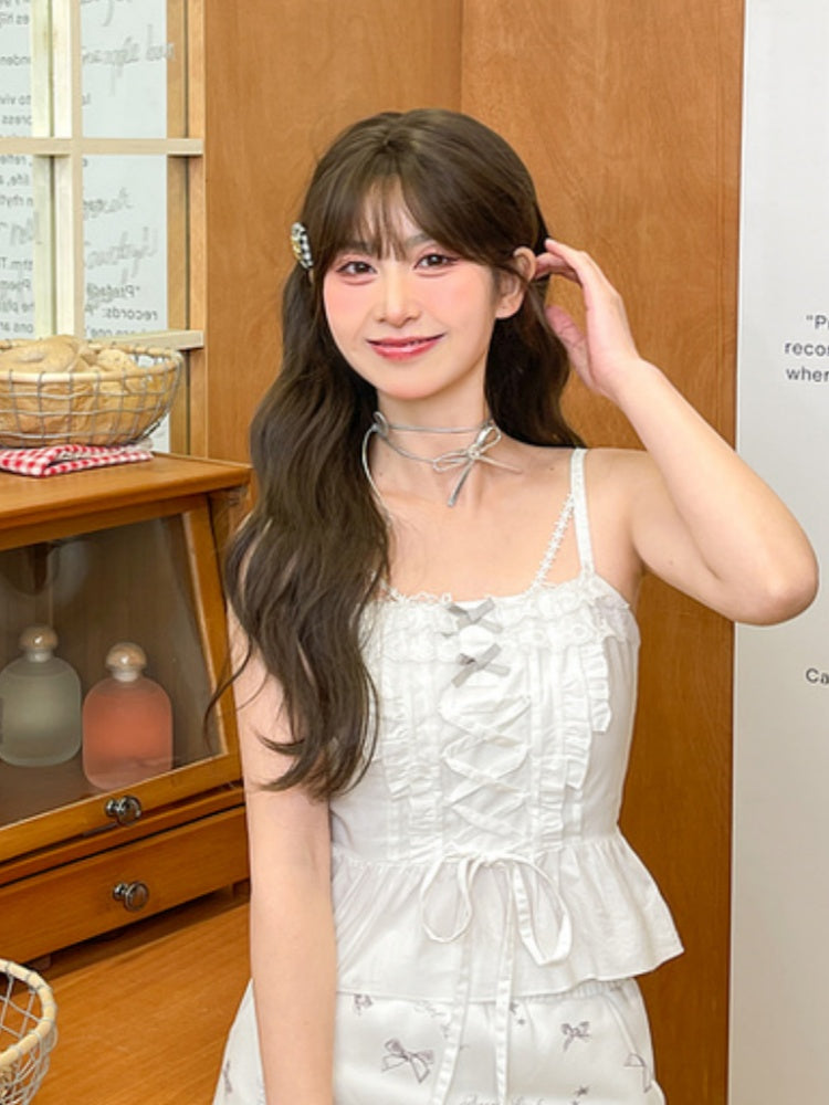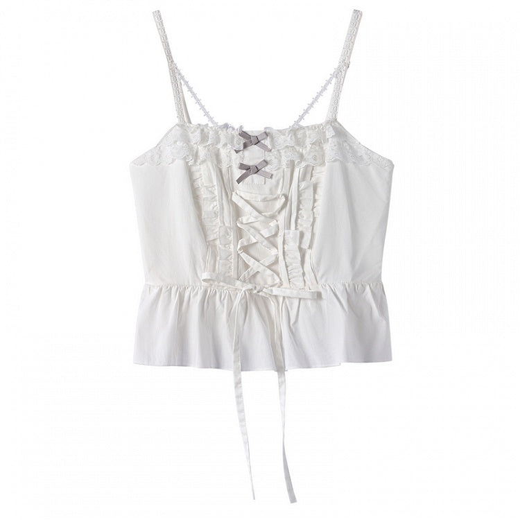 Weißes Camisole-Top mit Rüschen, Spitzenbesatz und Schleifendetails und Schnürdetail vorne