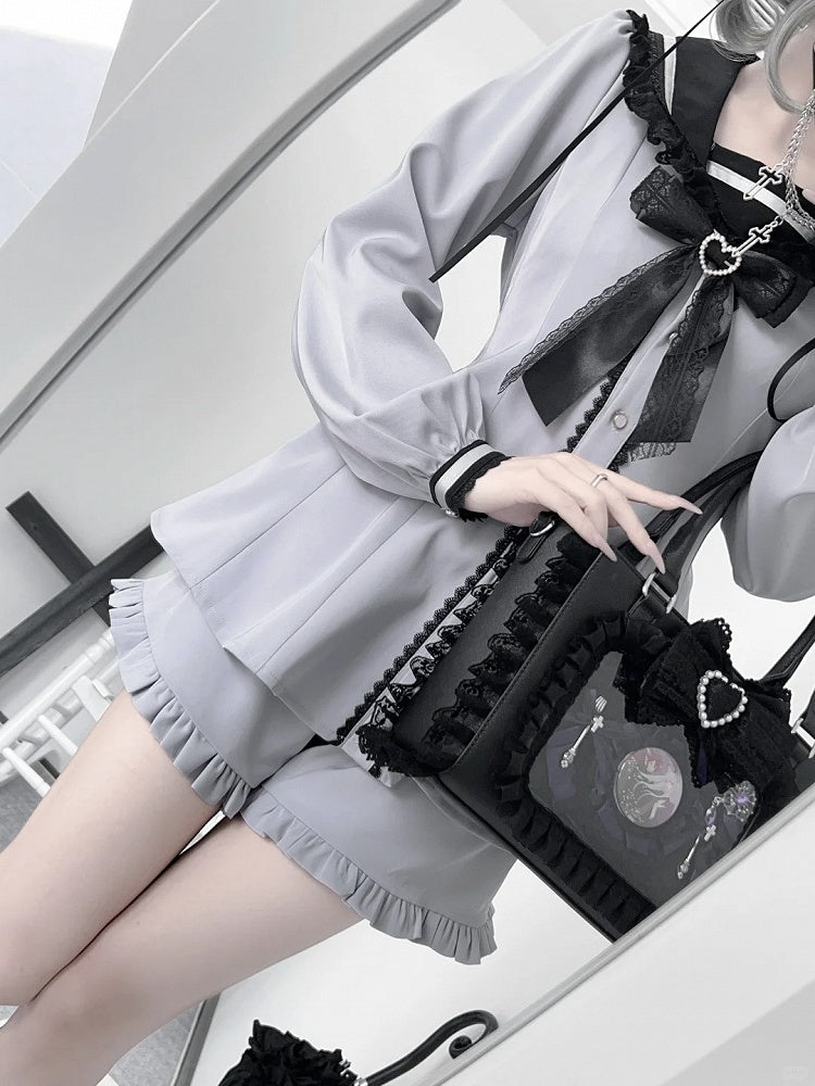 Lilafarbenes Design, Ohren, Krawatte, Jirai-Minikleid + Shorts-Set mit Rüschensaum + Schleife, Dusty Kei, Seemannskragen, Hase