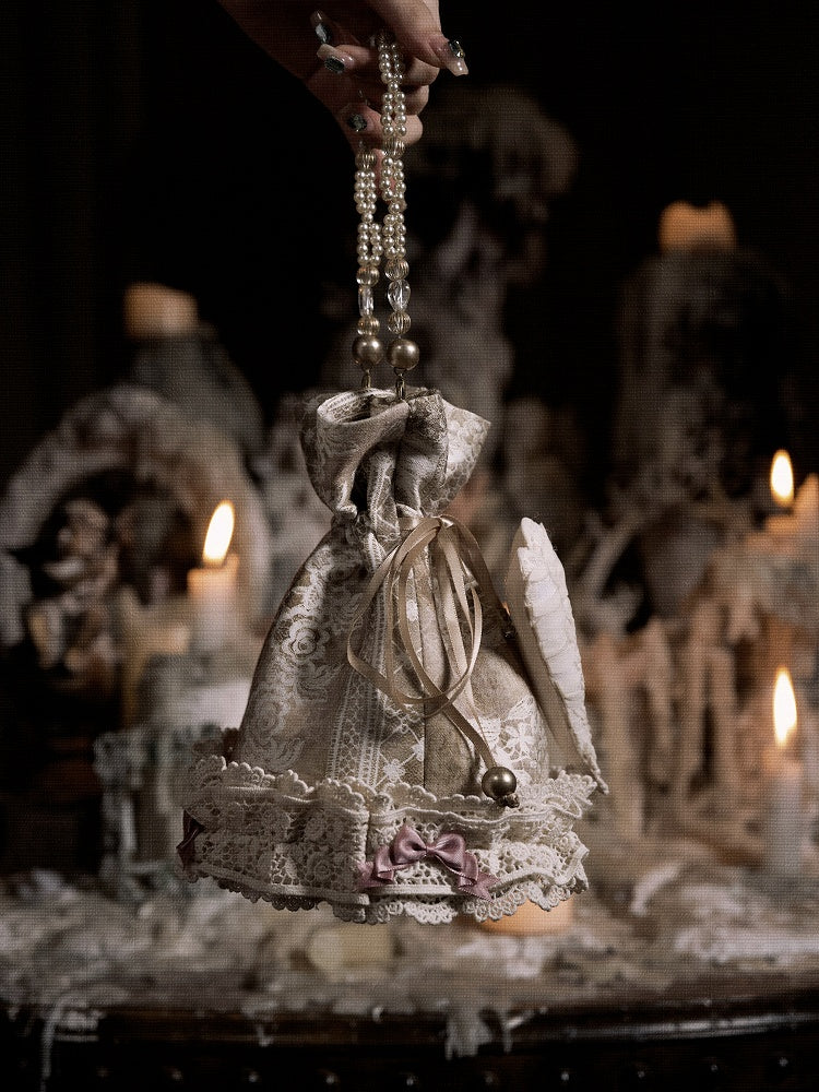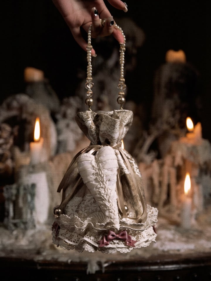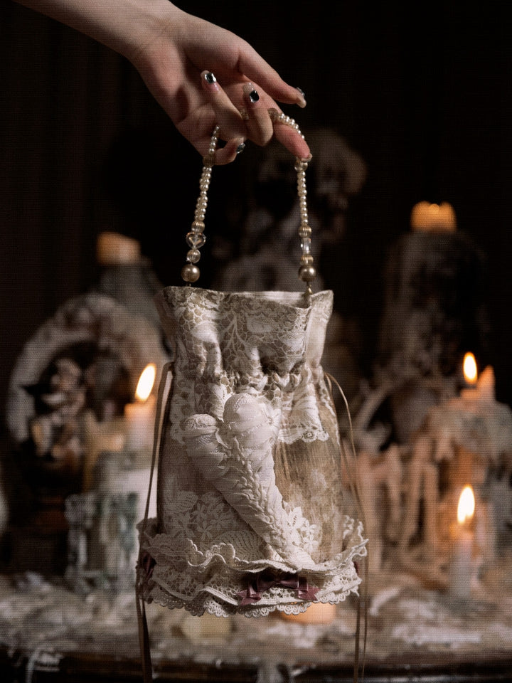 Lace and Bow Accents Vintage Drawstring Top Hand Bag with Heart Pin
