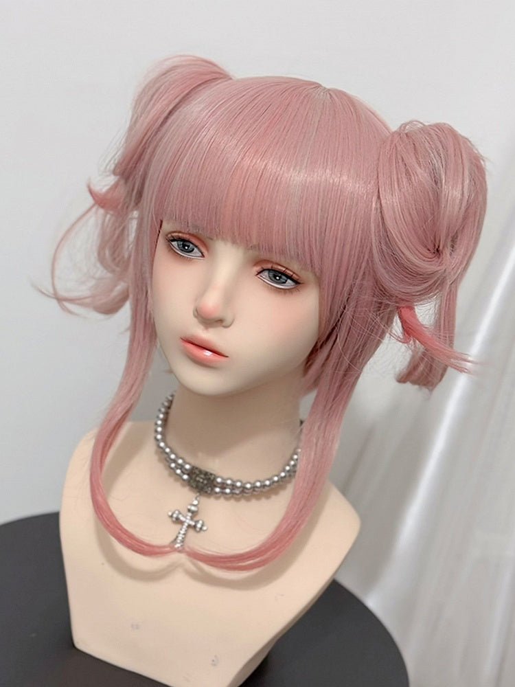 Rosa Perücke, 38 cm lang, mit Pony und doppelten, gewellten Pferdeschwanzklammern, 30 cm