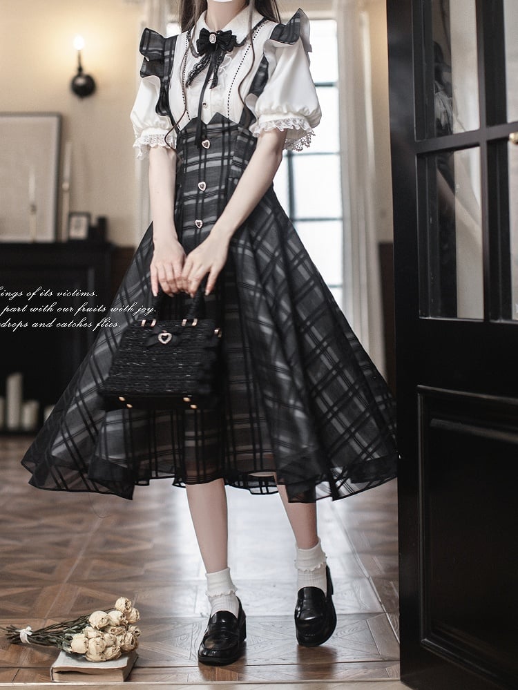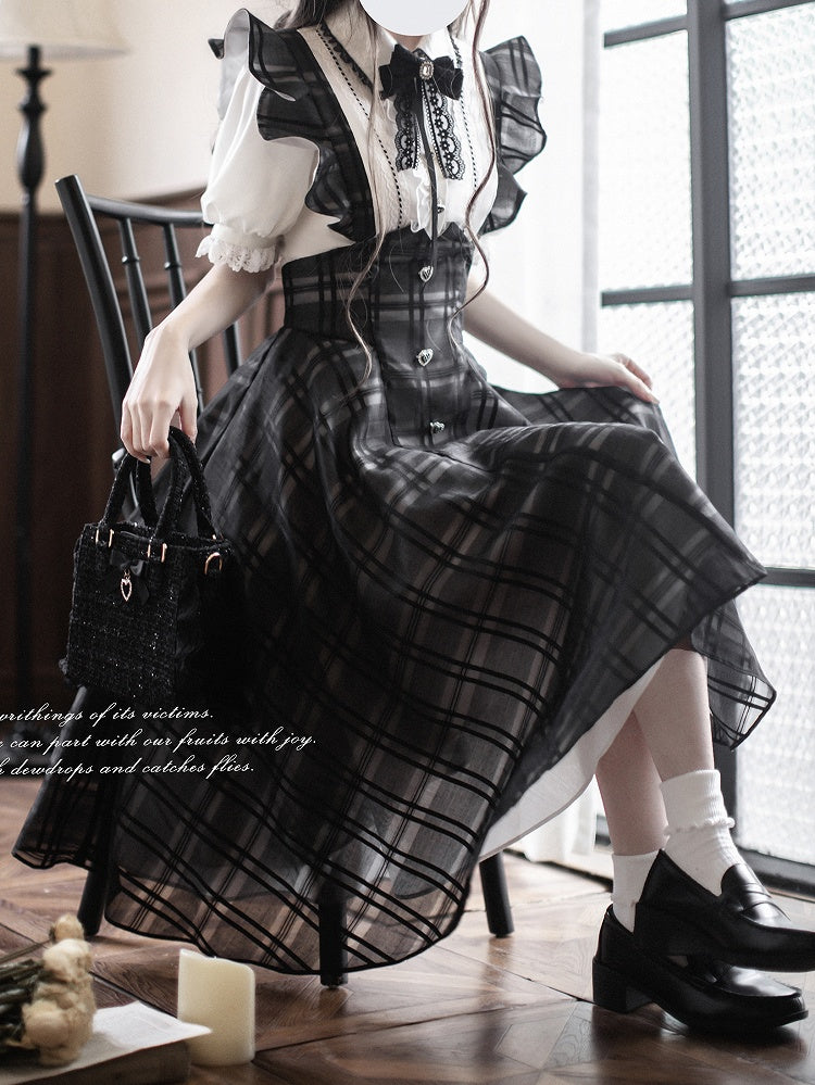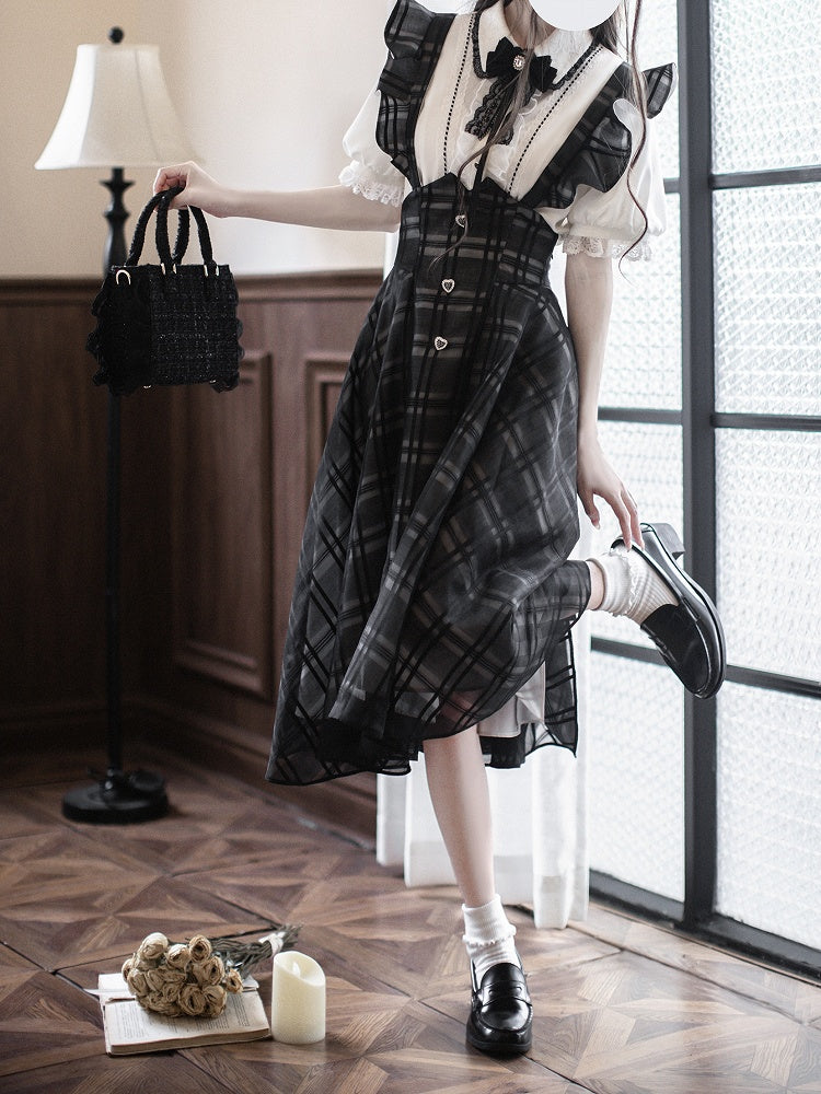 Jirai Kei – Overallkleid mit Flatterärmeln in schwarz kariertem Langformat mit umgekehrter Baskentaille