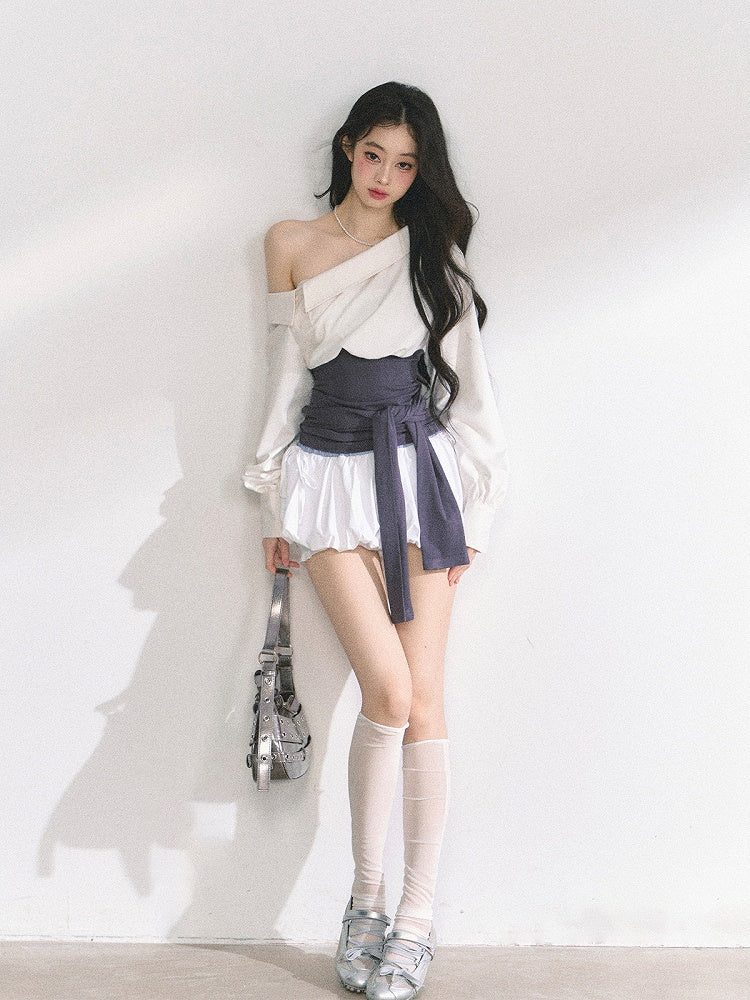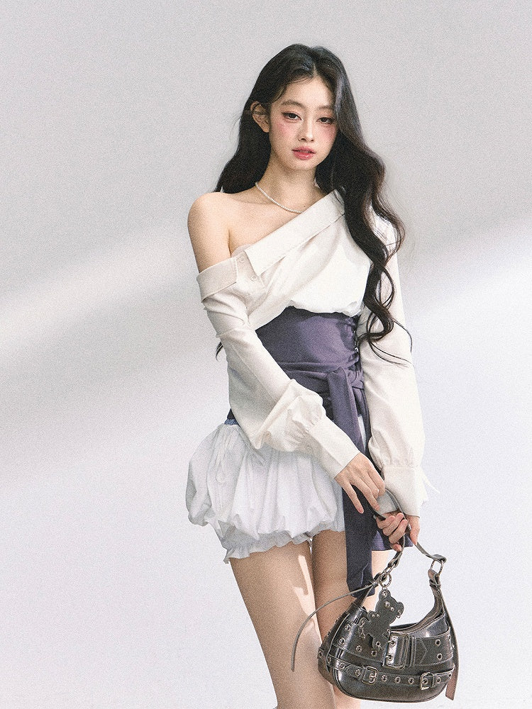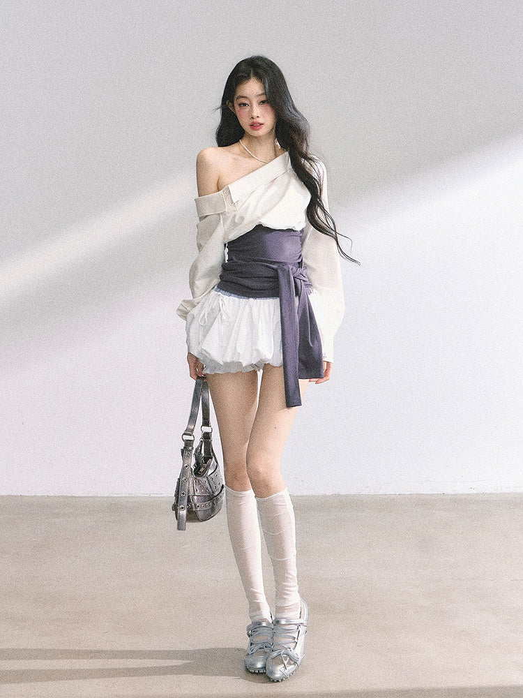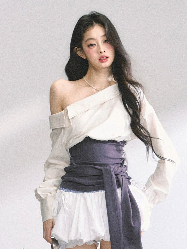 Beiges Hemd mit asymmetrischem Ausschnitt und lila Korsettgürtel