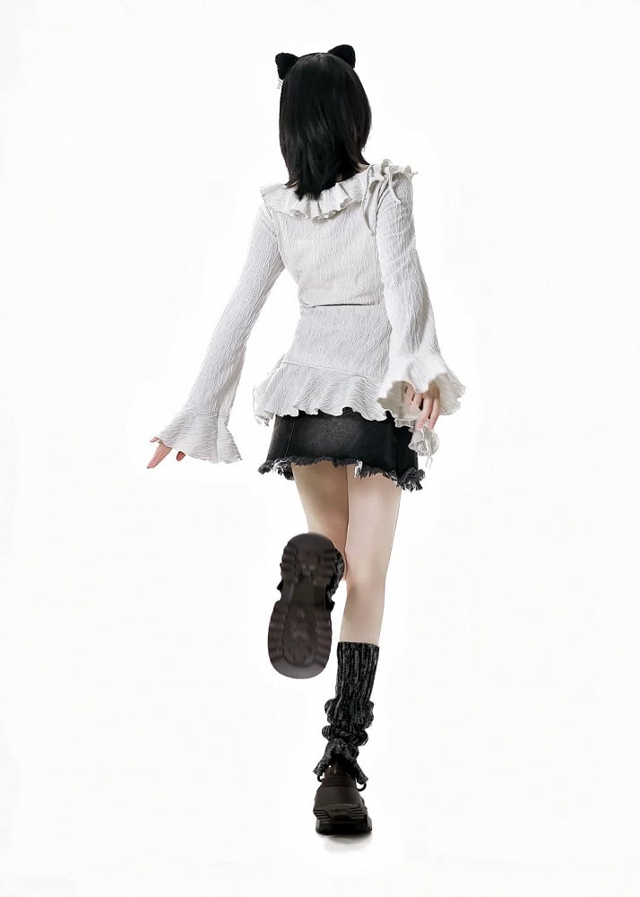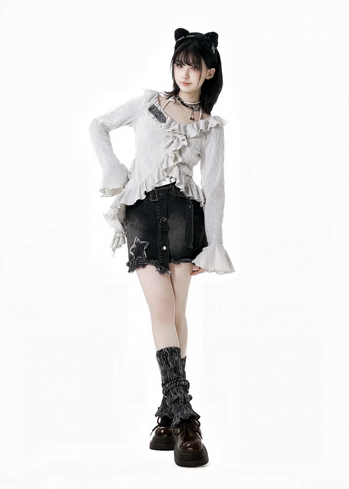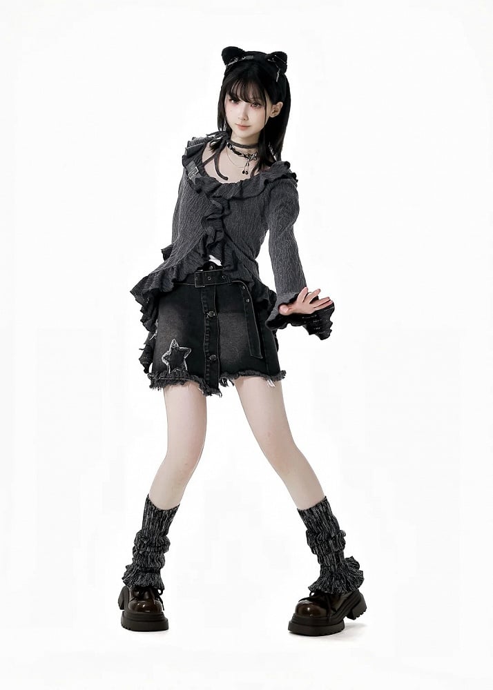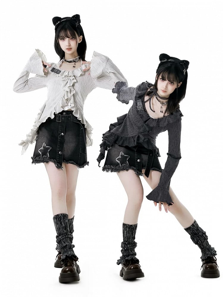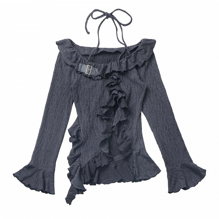 Kreieren Sie einen süßen und stylischen Look mit unserem beige/dunkelgrauen Neckholder-Stricktop mit Glockenärmeln und asymmetrischem Rüschensaum. Perfekt für jeden Anlass: Dieses Top bietet Ihnen den ganzen Tag über Komfort und modischen Tragekomfort.
