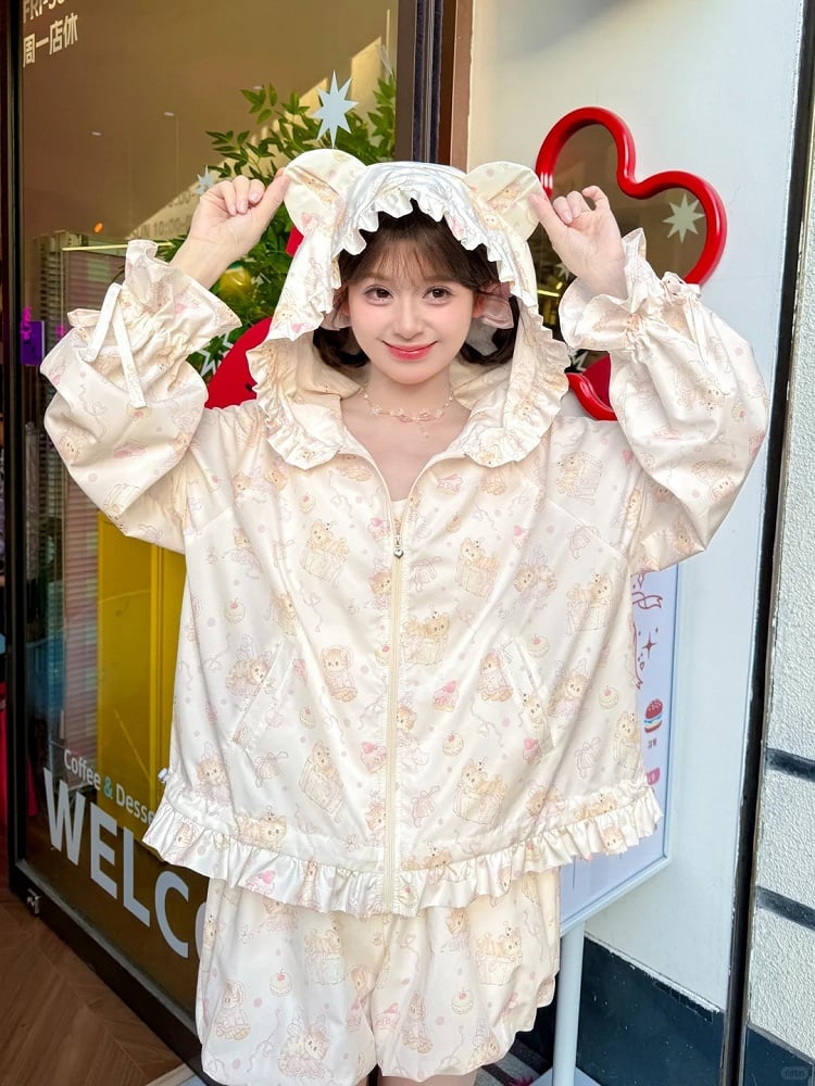 Beigefarbene Bubble-Shorts mit elastischer Taille und Allover-Kitty-Print