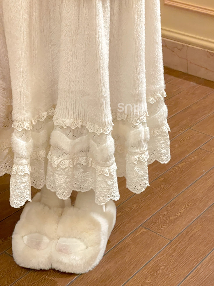 Beigefarbener Midirock mit hoher Taille und Spitzenakzenten und Volantsaum