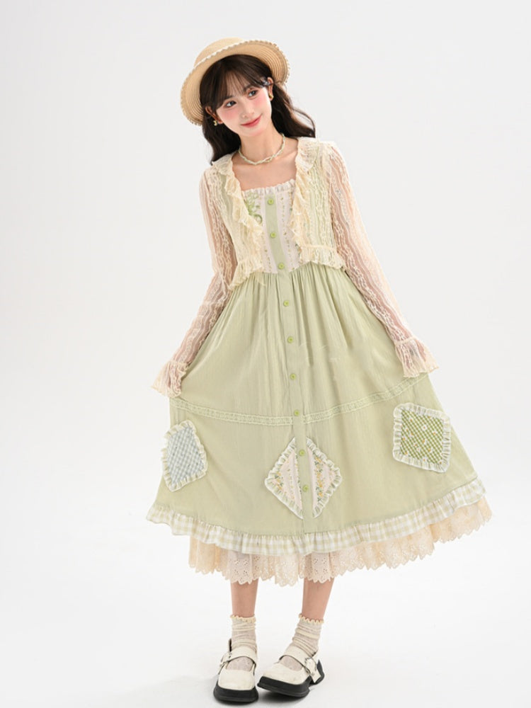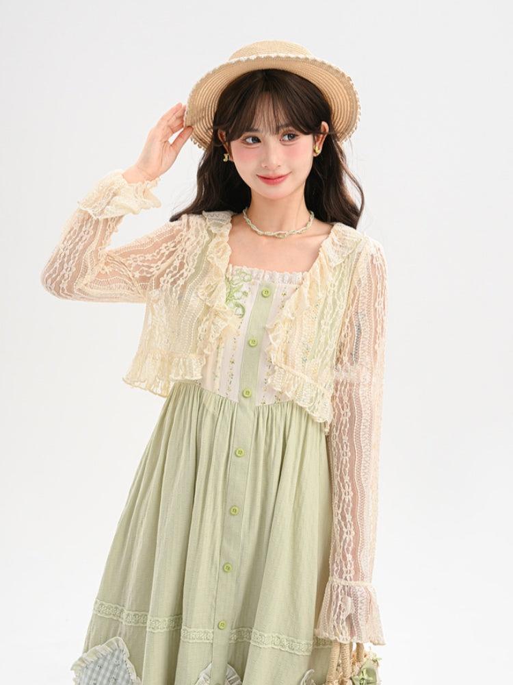 Beiges Spitzentop mit Rüschenbesatz und offener Knopfleiste