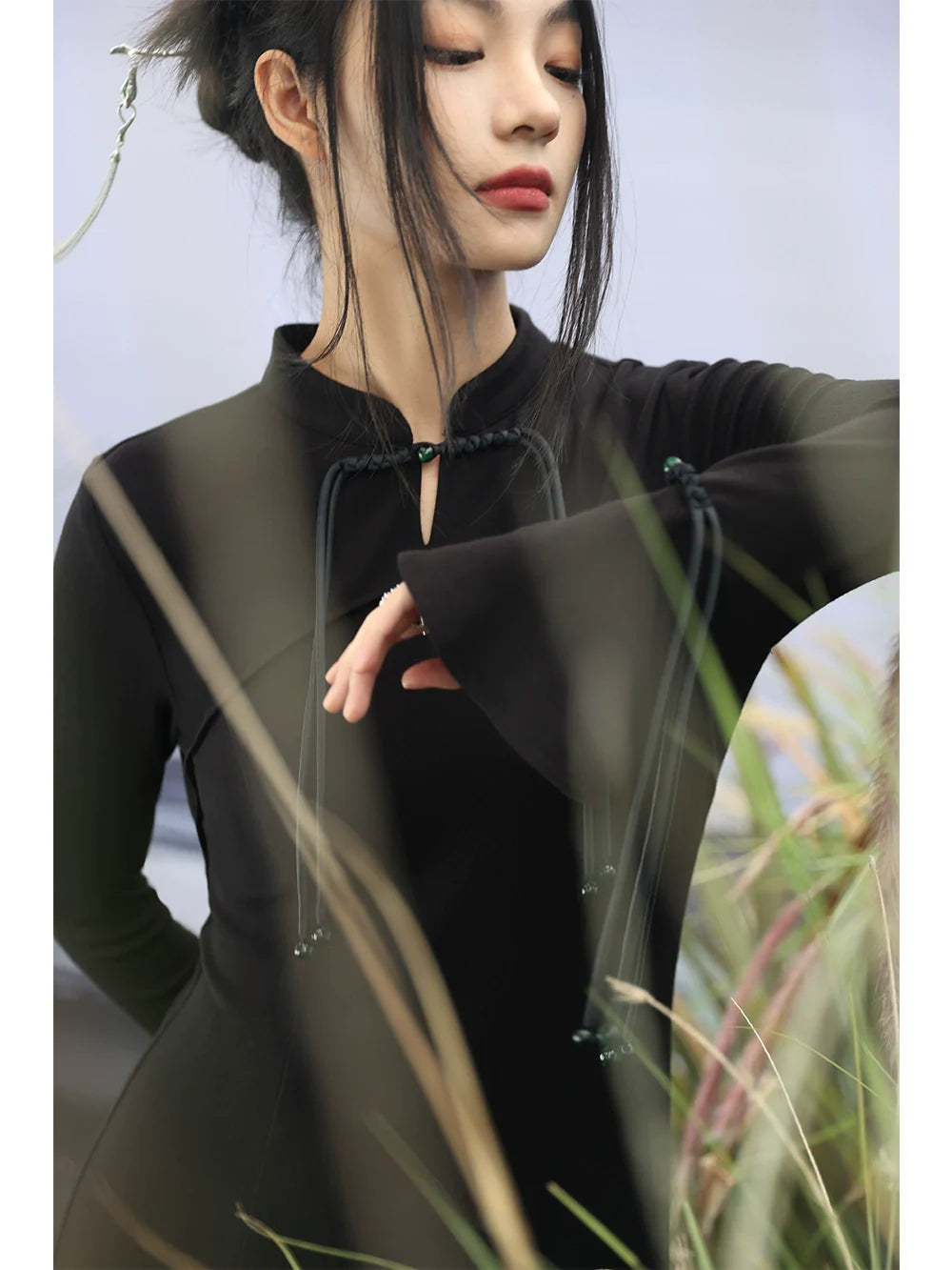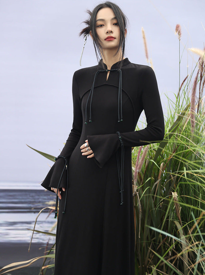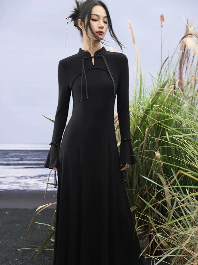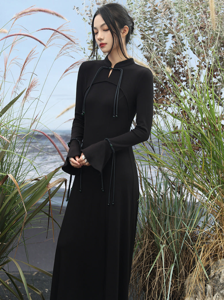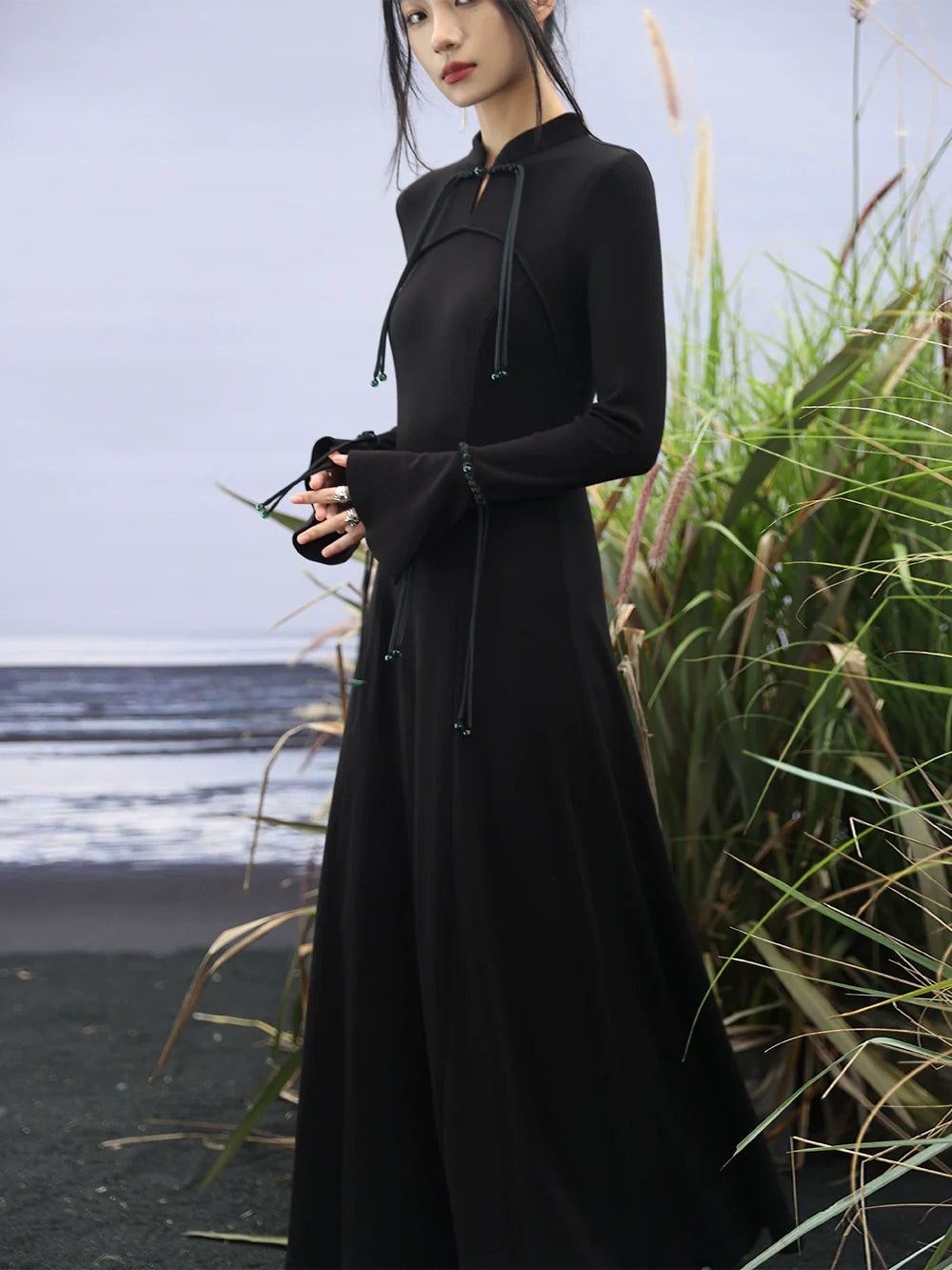 Glockenstrickkleid mit Retro-Ärmeln, Chinaschnalle, lang