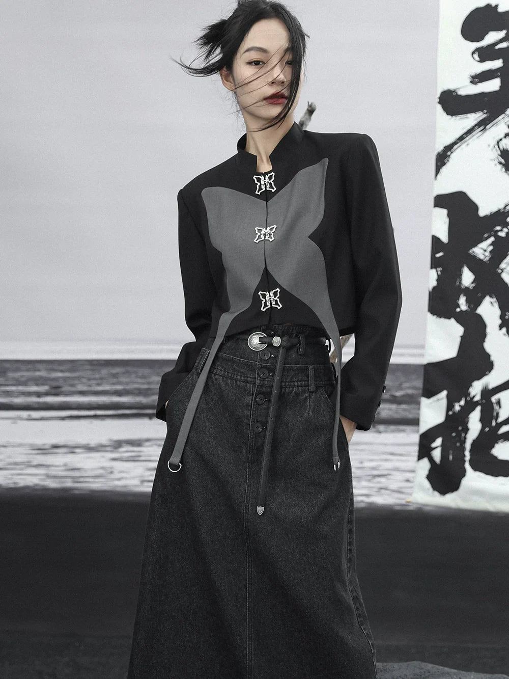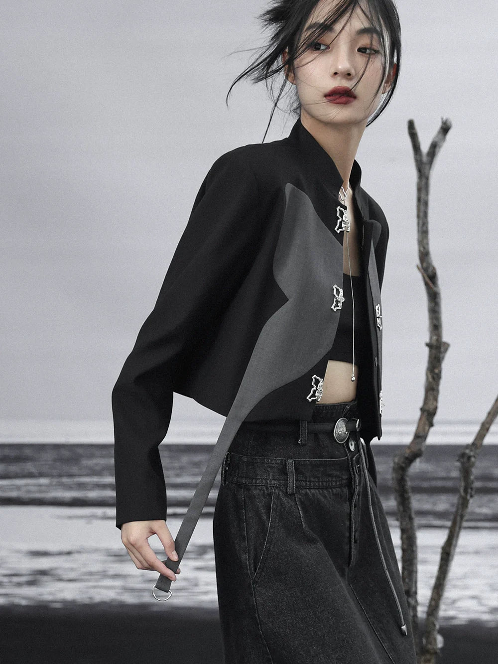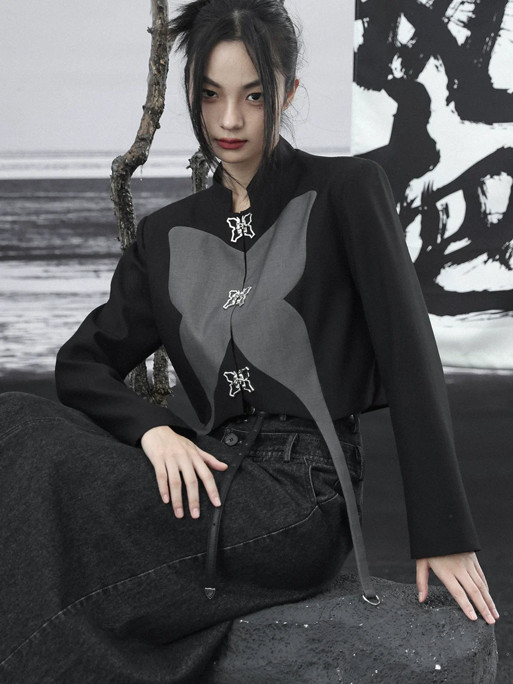 Zweifarbiges silbernes Top mit kurzem Design und Schmetterling