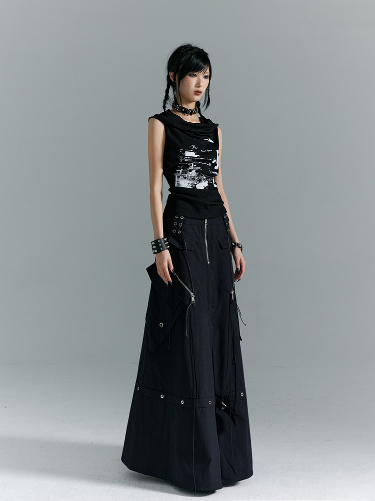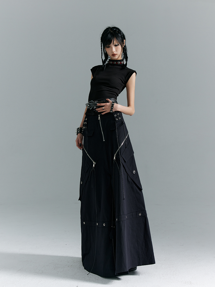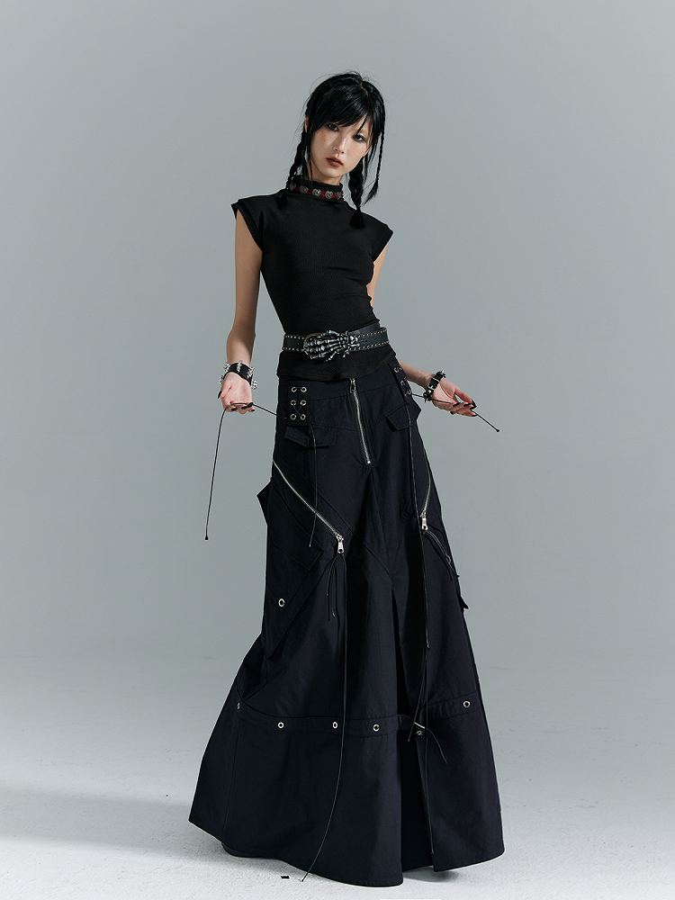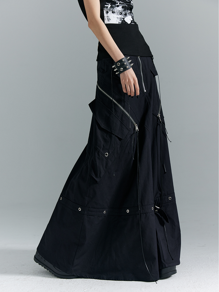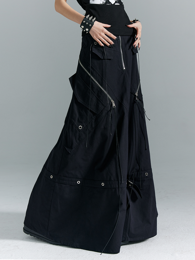Schwarzer Punk-A-Linien-Rock mit Metallschnallen und Reißverschlusstaschen