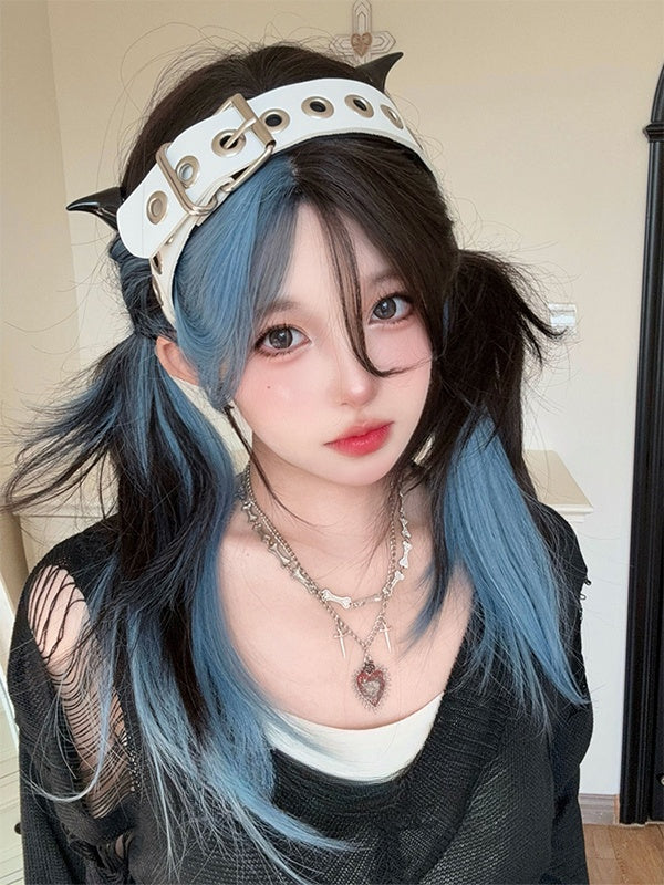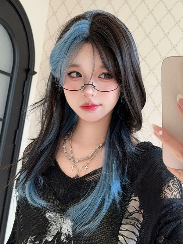 Lange, glatte Kunsthaarperücke mit schwarzen und blauen Highlights und Pony