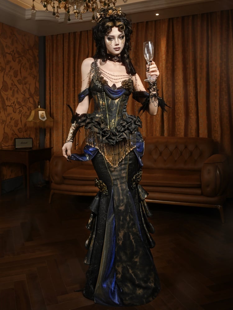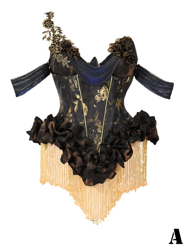 Korsett-Oberteil mit schwarzen und goldenen Quasten und goldener Chiffonrock