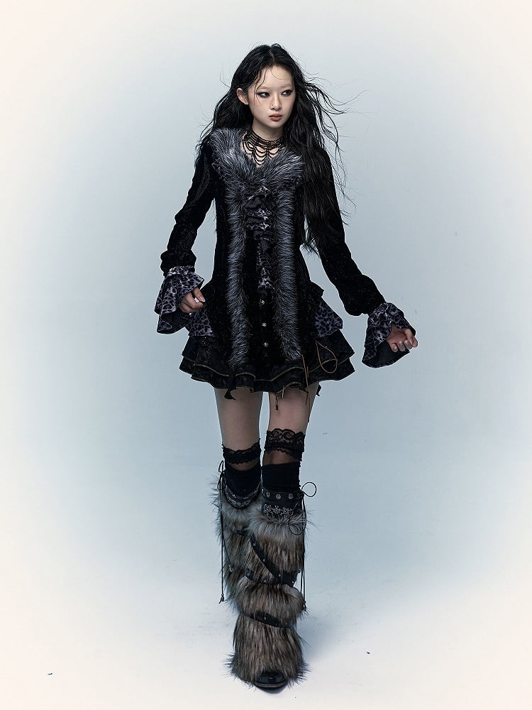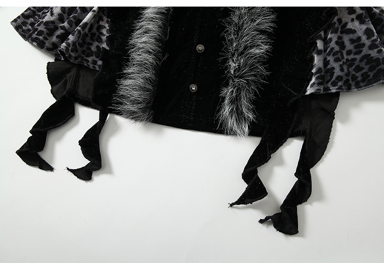 Schwarzes und graues Oberteil mit Leopardenmuster und zotteligem Besatz