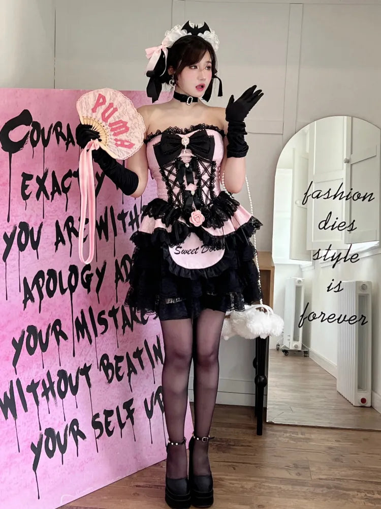 Schwarzes und rosafarbenes trägerloses Prinzessinnen-Korsett-Top mit Schnürung / Schwarze Spitzen-Pumphose