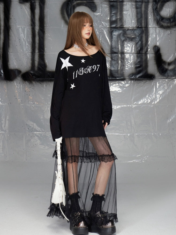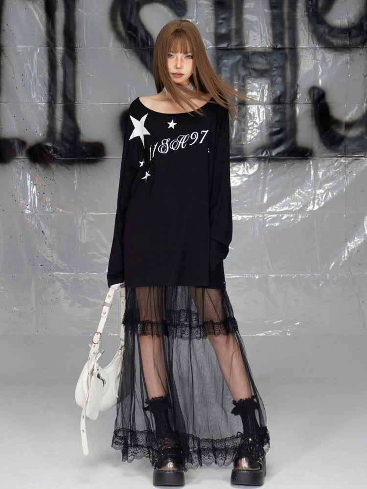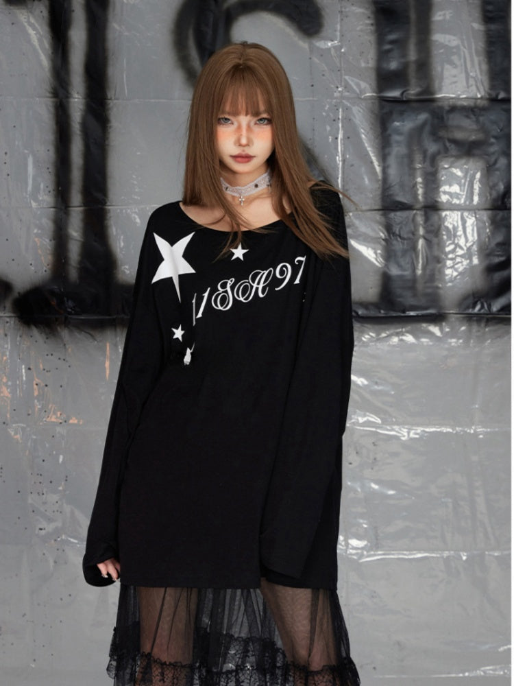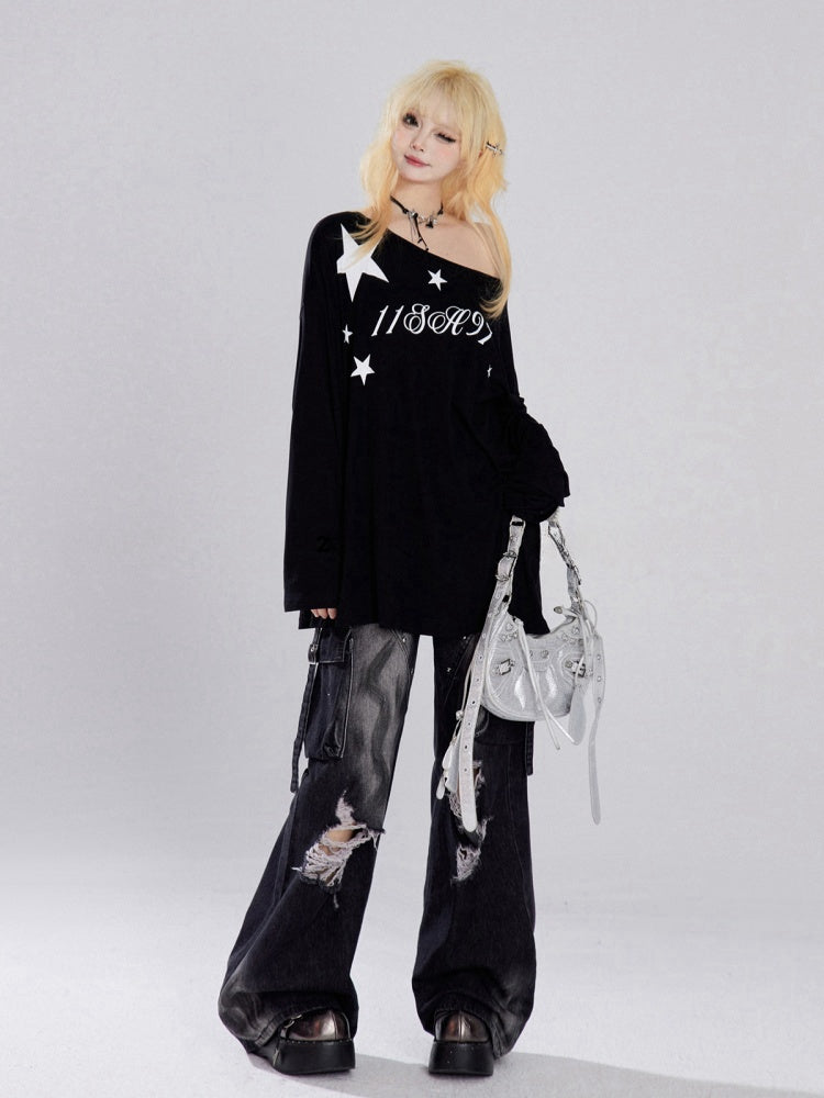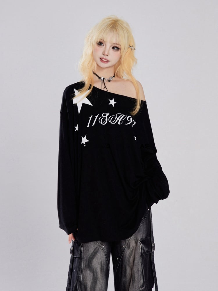 Schwarzes, lockeres Oberteil mit asymmetrischem Ausschnitt und Buchstabendruck