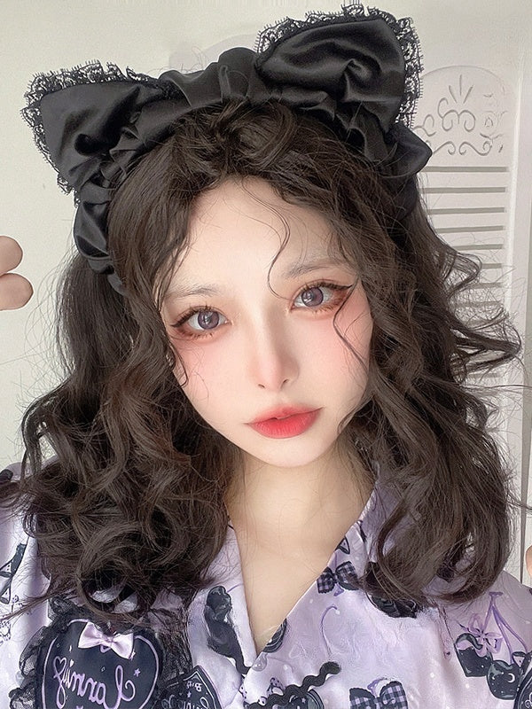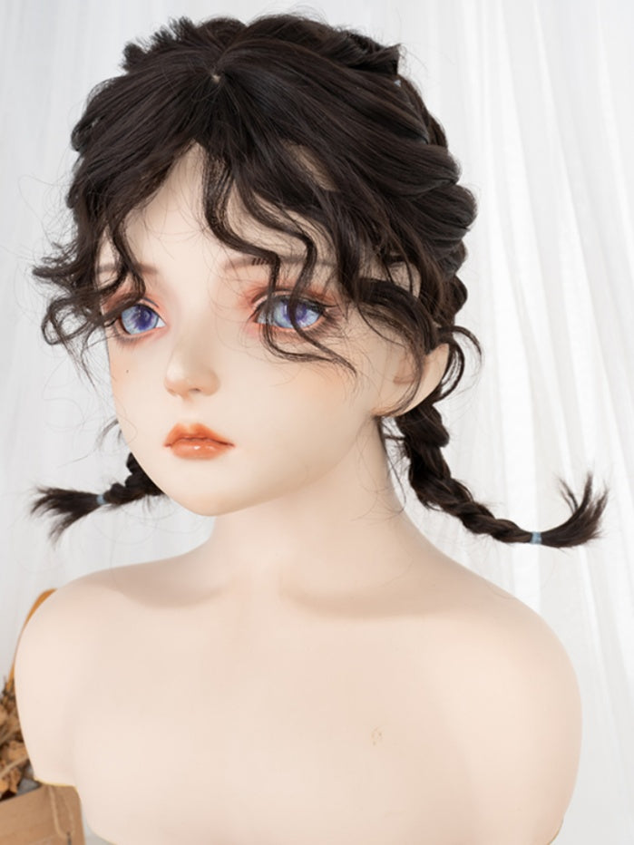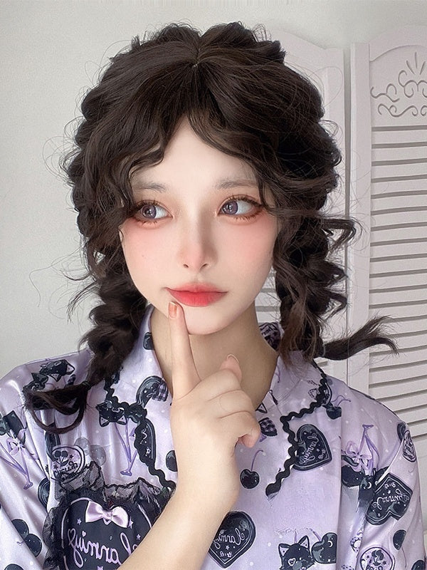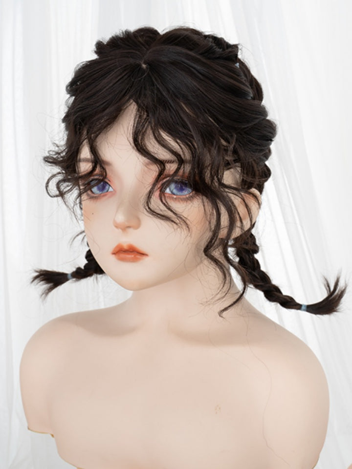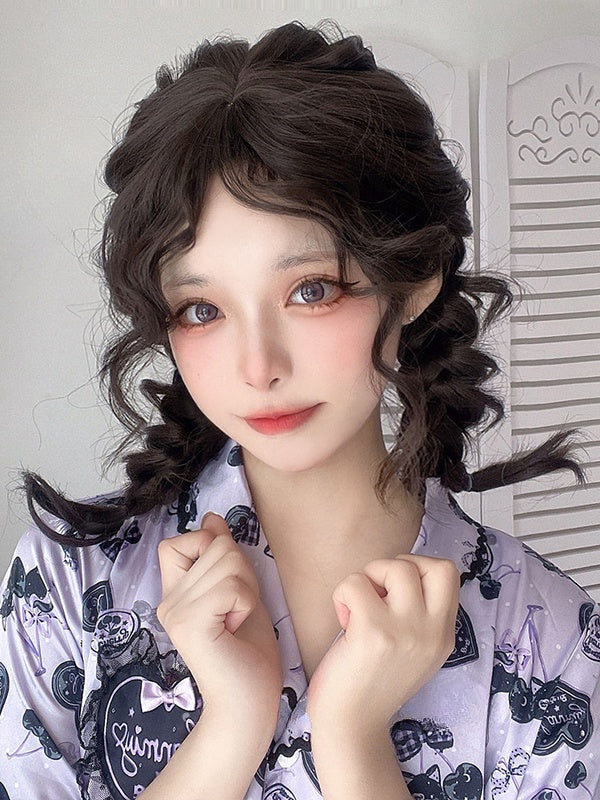 Schwarzbraune 40 cm schulterlange lockige Perücke mit Pony