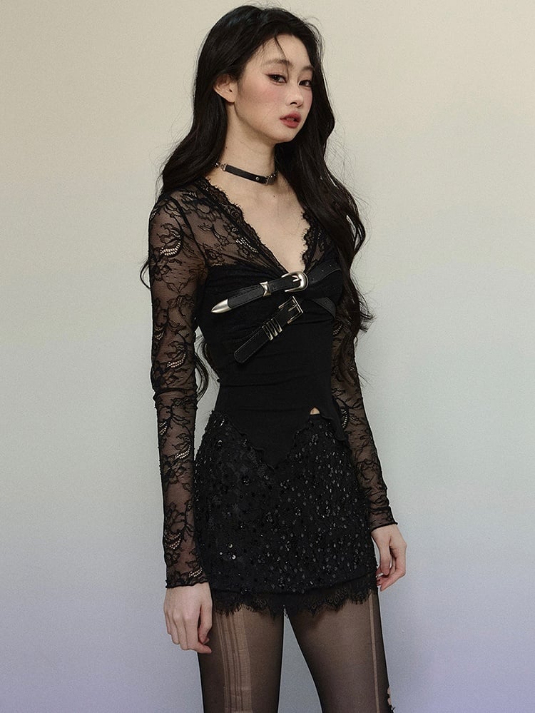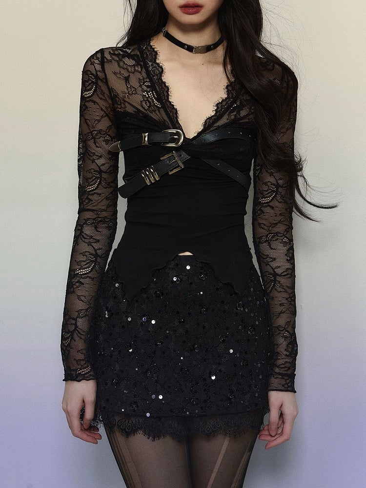 Dieses schwarze V-Ausschnitt-Spitzenstrick-Langarmtop mit Schnallenträgern ist nicht nur stylisch und modisch, sondern auch bequem und vielseitig. Das einzigartige Design mit Schnallenträgern und Spitzenstrick verleiht jedem Outfit einen Hauch von Niedlichkeit. Perfekt für jeden Anlass, ist dieses Top ein Must-have für Ihre Garderobe.