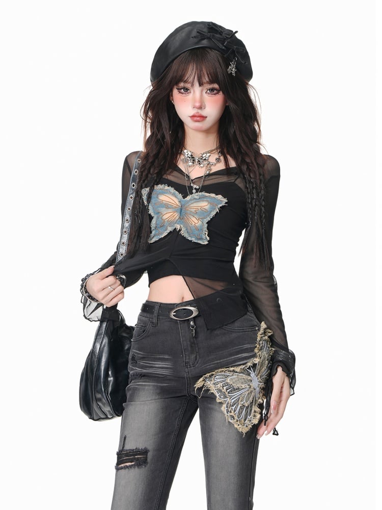 Diese Jeans mit schwarzen Schmetterlingsapplikationen und Used-Optik verleiht einen einzigartigen und charmanten Look. Das Fischschwanz-Design verleiht ihr einen femininen Touch und macht sie zur perfekten Ergänzung Ihrer Garderobe. Bleiben Sie modisch und süß mit dieser schwarzen Schmetterlingsjeans.