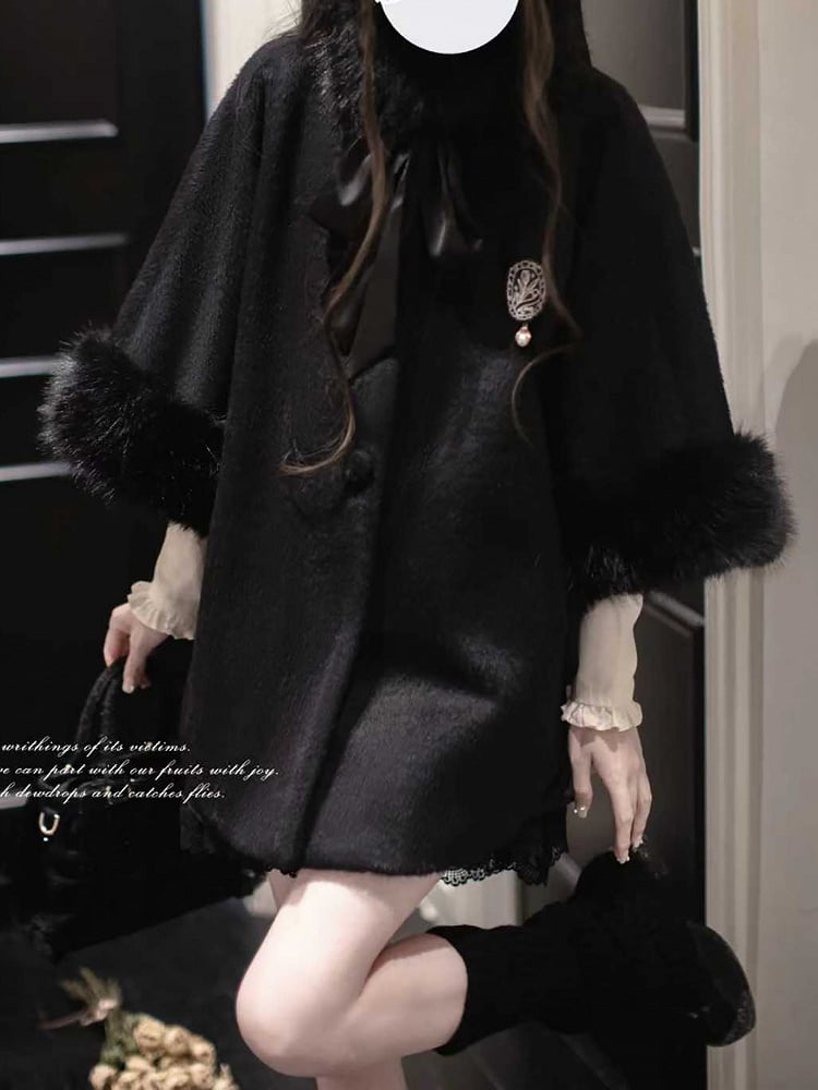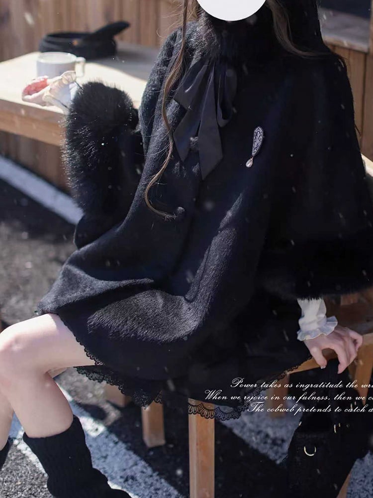 Black Jirai Kei Cape Coat with Plush Collar & Cuffs - A Cozy Fall & Winter Essential
