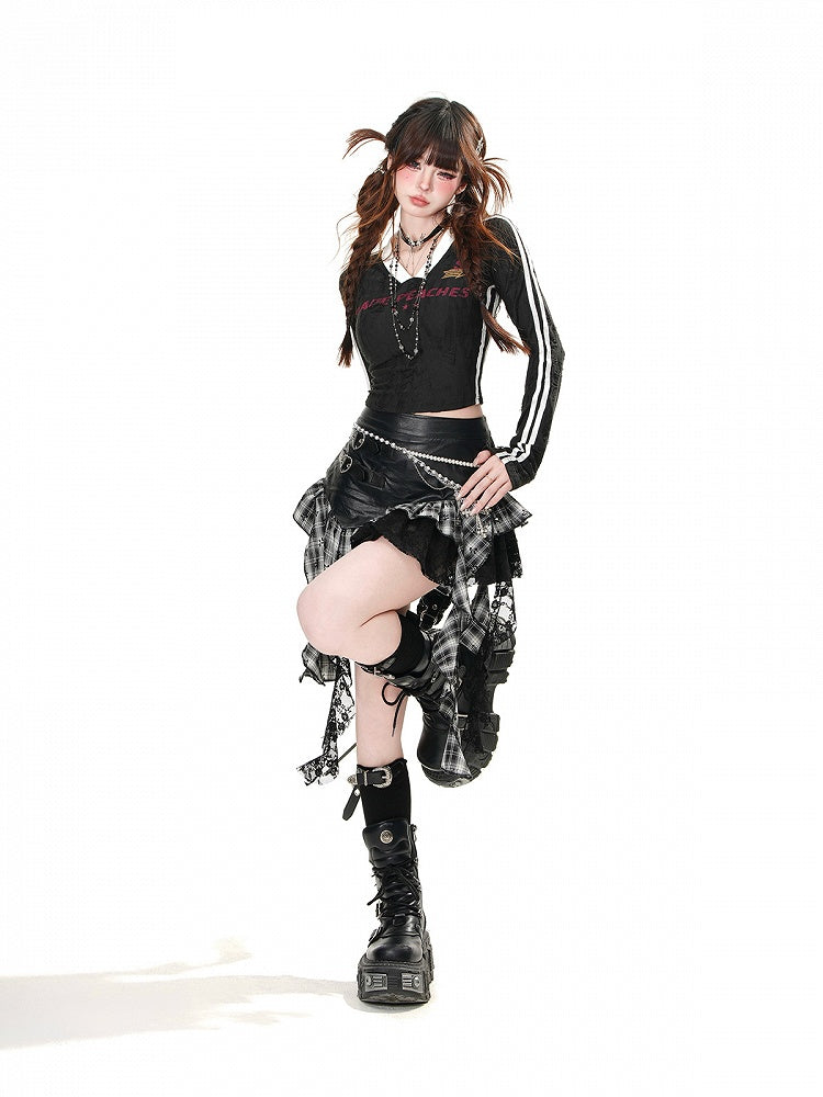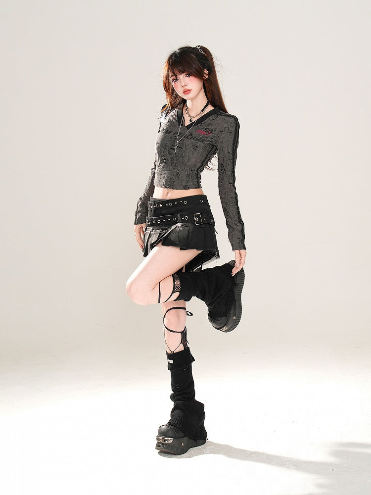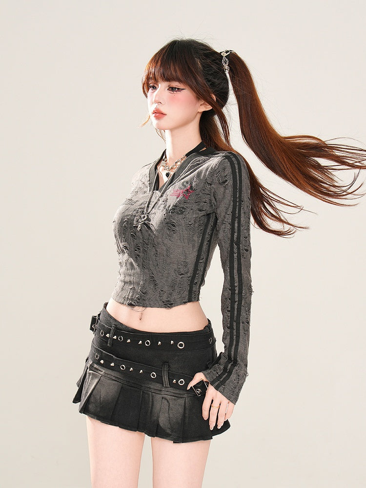 Dieses kurze Top besticht durch sein einzigartiges Distressed-Design mit charmanten Löchern, die seiner dunklen Farbe einen Hauch von Niedlichkeit verleihen. Dieses Top mit V-Ausschnitt ist eine perfekte Mischung aus Glamour und Komfort und lässt Sie in jedem Outfit hervorstechen.