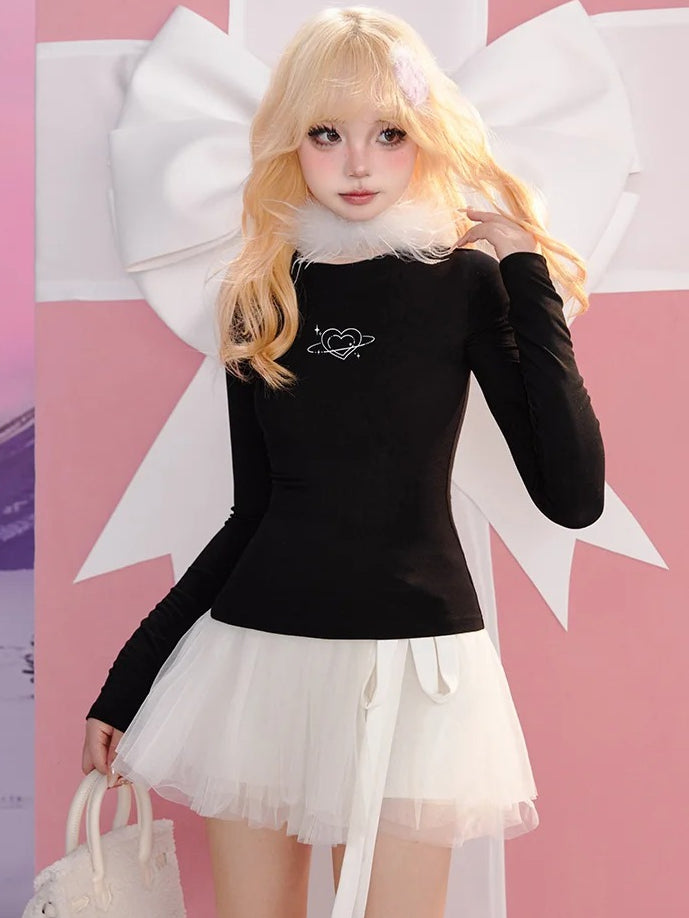 Schwarzes, eng anliegendes Langarm-Top mit Rundhalsausschnitt und Herz-Print