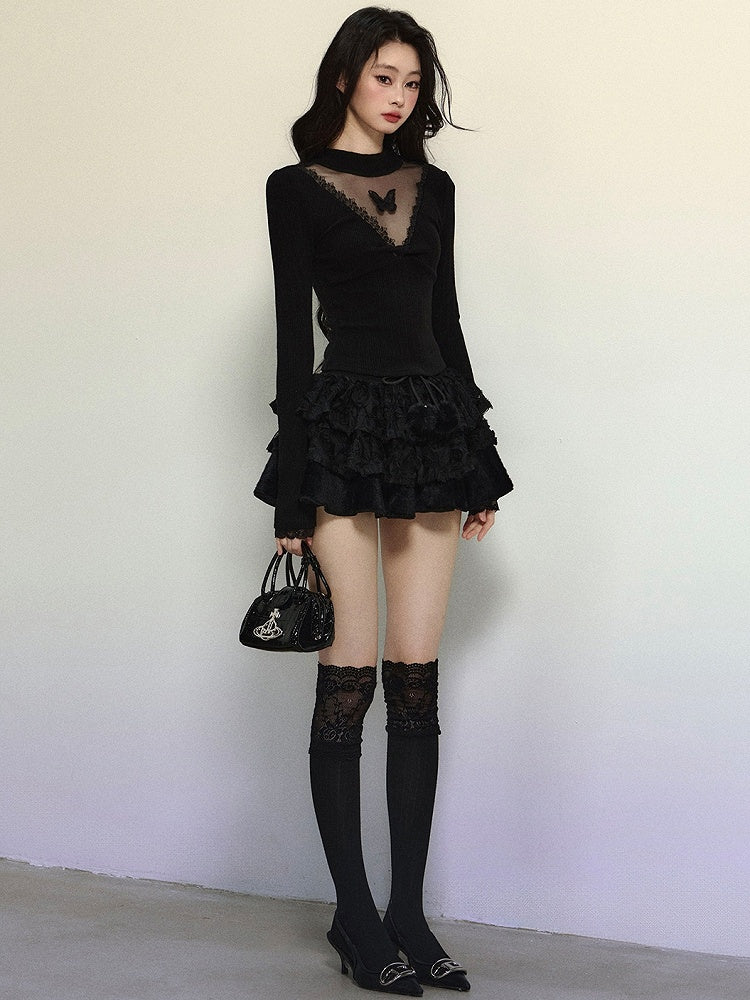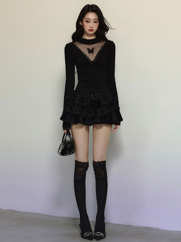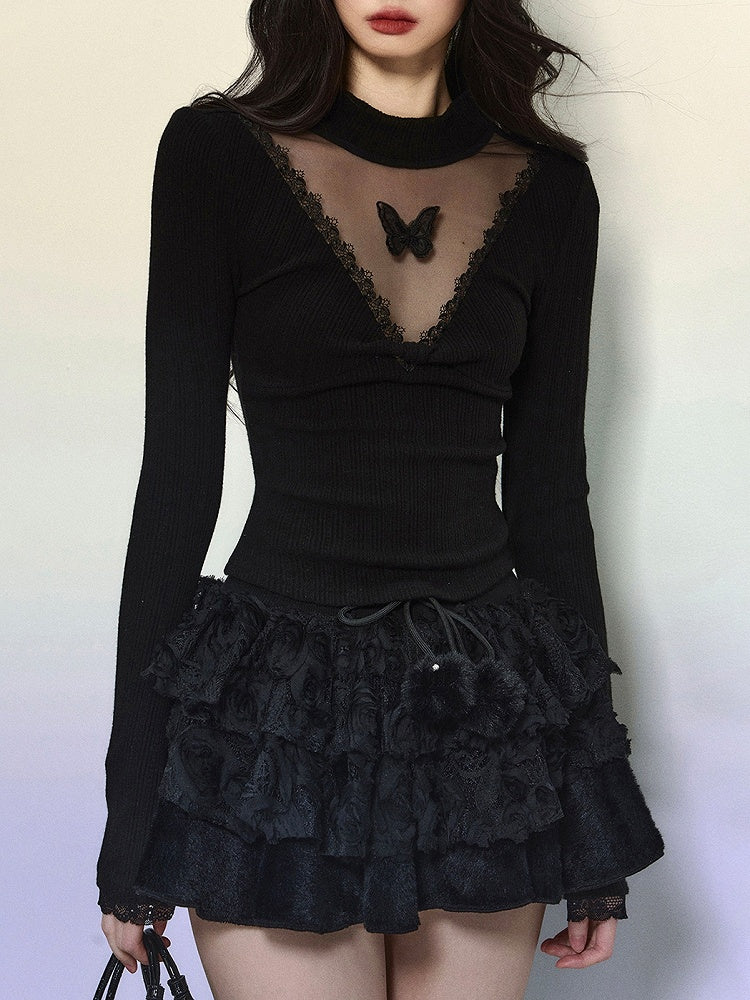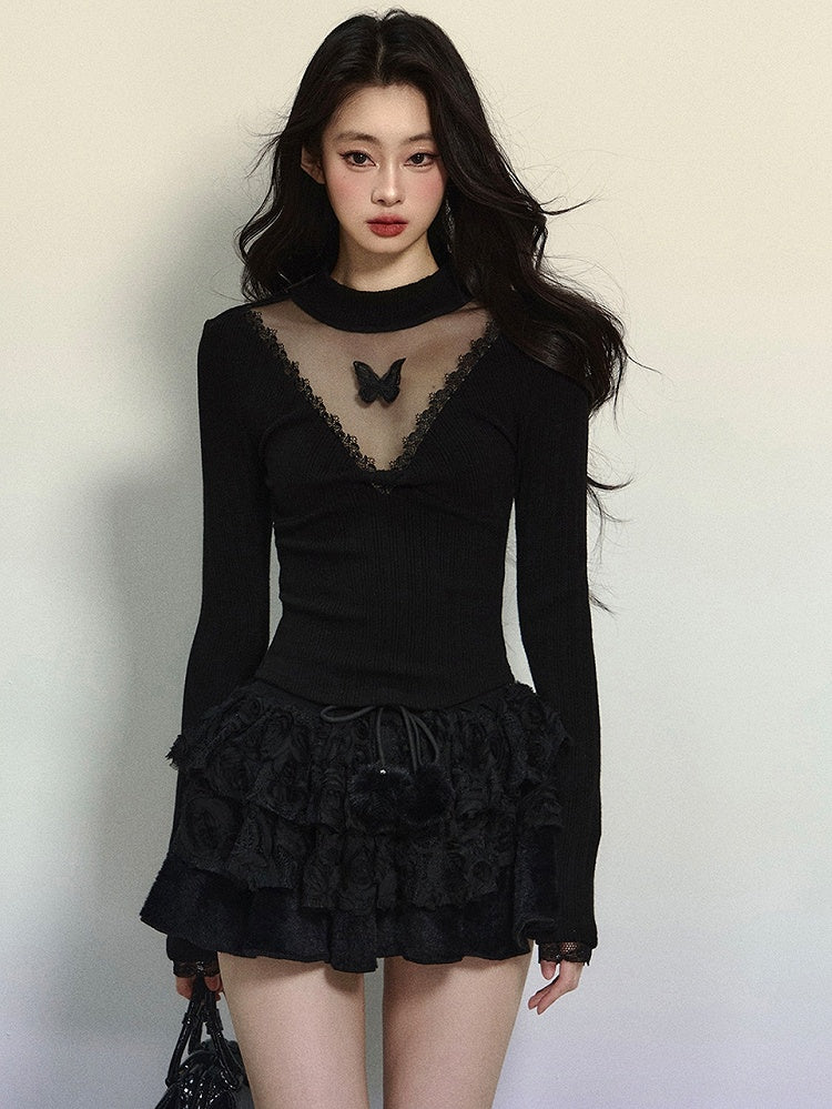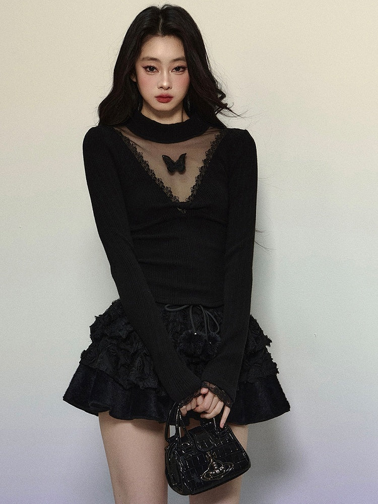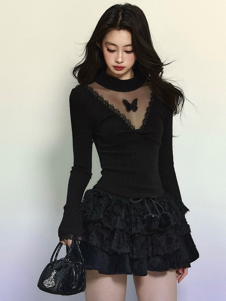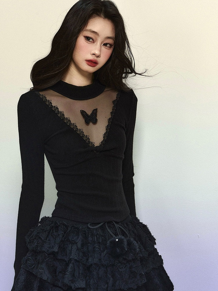 Schwarzes, langärmliges Top mit Illusionsausschnitt und Schmetterlingsakzenten