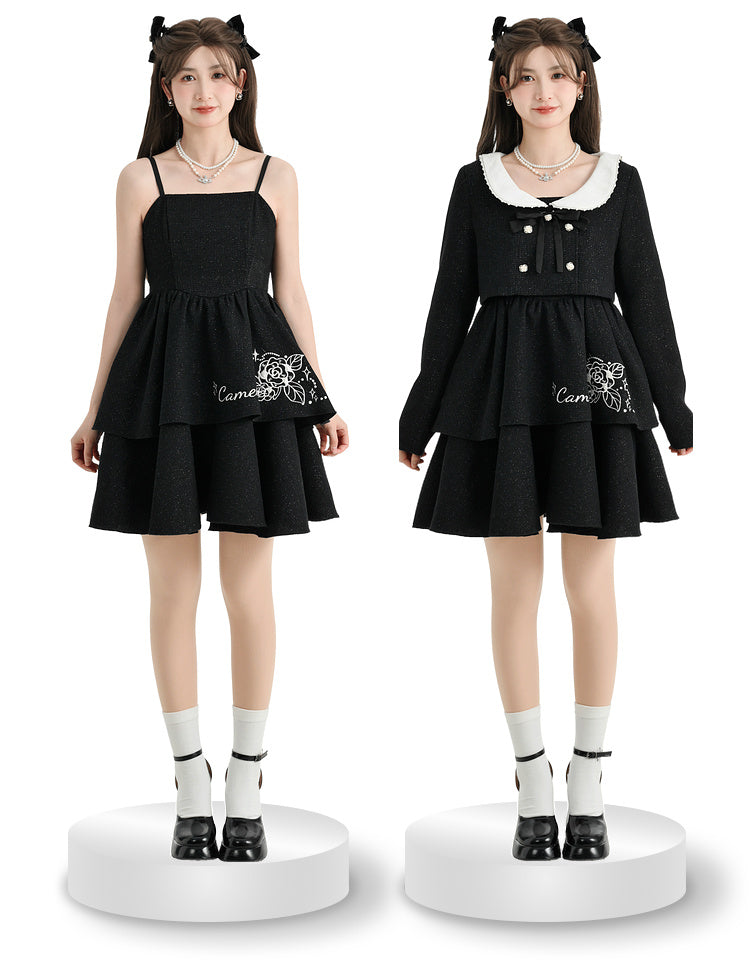 Dieses süße, duftende schwarze Jackenkleid besticht durch sein Hosenträgerdesign mit glitzernden Rosen- und Perlenakzenten. Verströmen Sie mit diesem vielseitigen kurzen Anzug sowohl Eleganz als auch Verspieltheit.