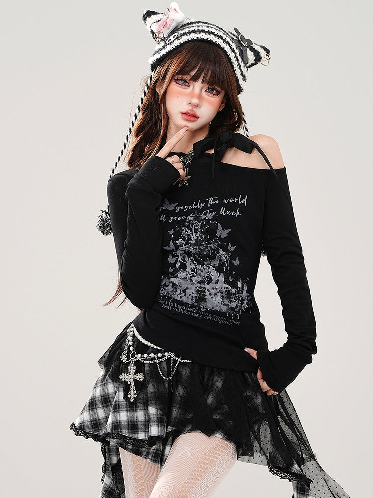 Schwarzes Oberteil mit Buchstaben und Schmetterlingen, asymmetrischem Ausschnitt und langen Ärmeln