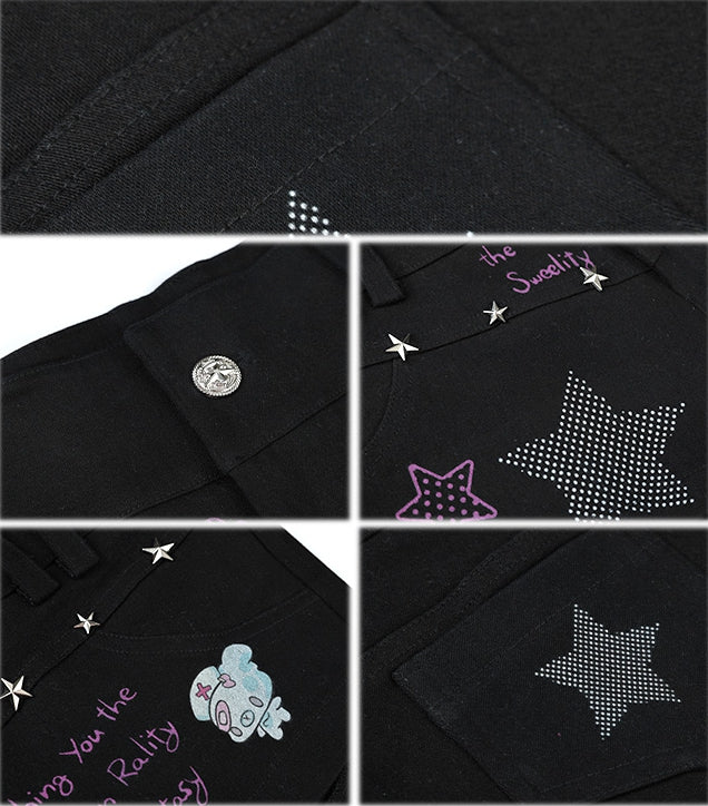 Schwarze Shorts mit niedrigem Bund und Graffiti-Print mit Sternnieten