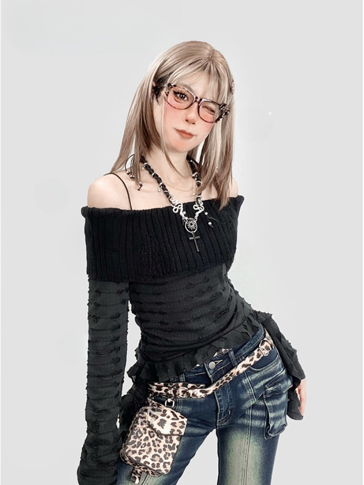 Schwarzes Top mit schulterfreiem Ausschnitt und asymmetrischem Rüschensaum