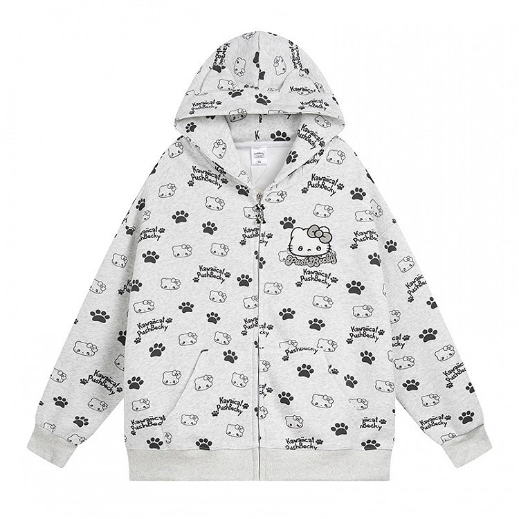 Dieser schwarz/pink/hellblaue Kapuzenpullover mit Allover-Kitties-Print und Reißverschluss verleiht Ihrer Garderobe einen Hauch von Niedlichkeit. Der verspielte Kätzchen-Print in Schwarz-, Pink- und Hellblautönen setzt ein Statement und hält Sie mit dem Reißverschluss-Design warm und gemütlich.
