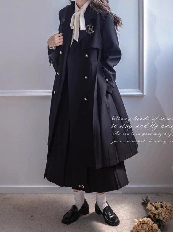Schwarzes Band, besticktes Abzeichen, College-Metall-Plissee-Trenchcoat + Mantel, Hemd, Rock