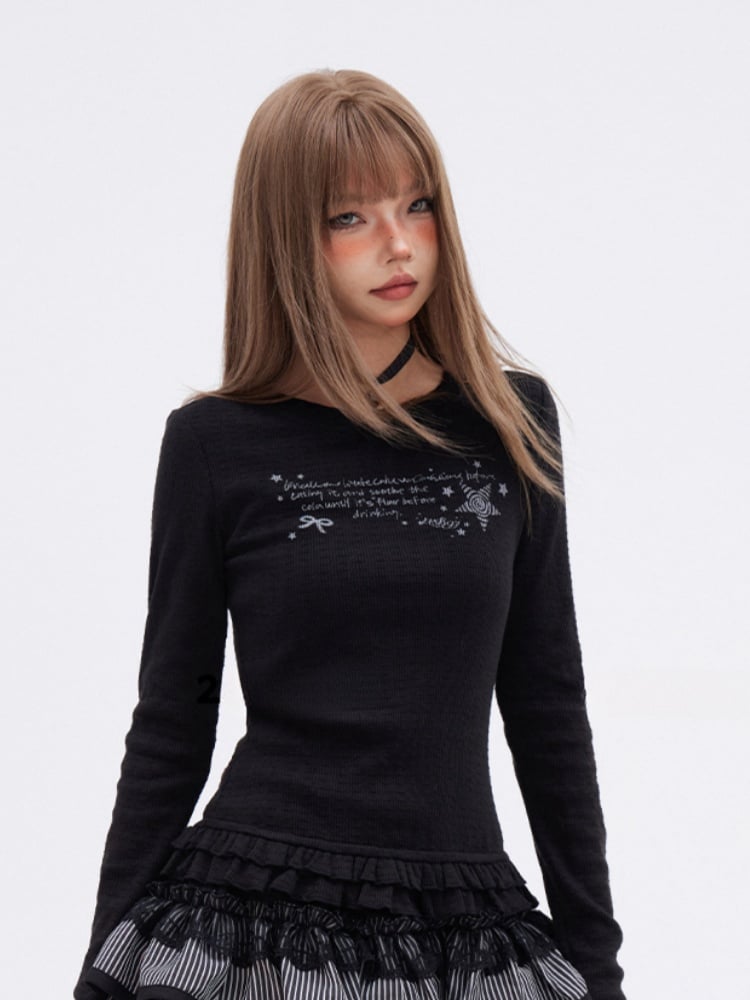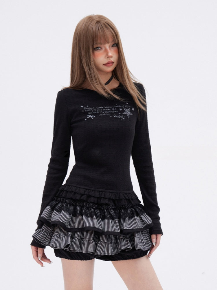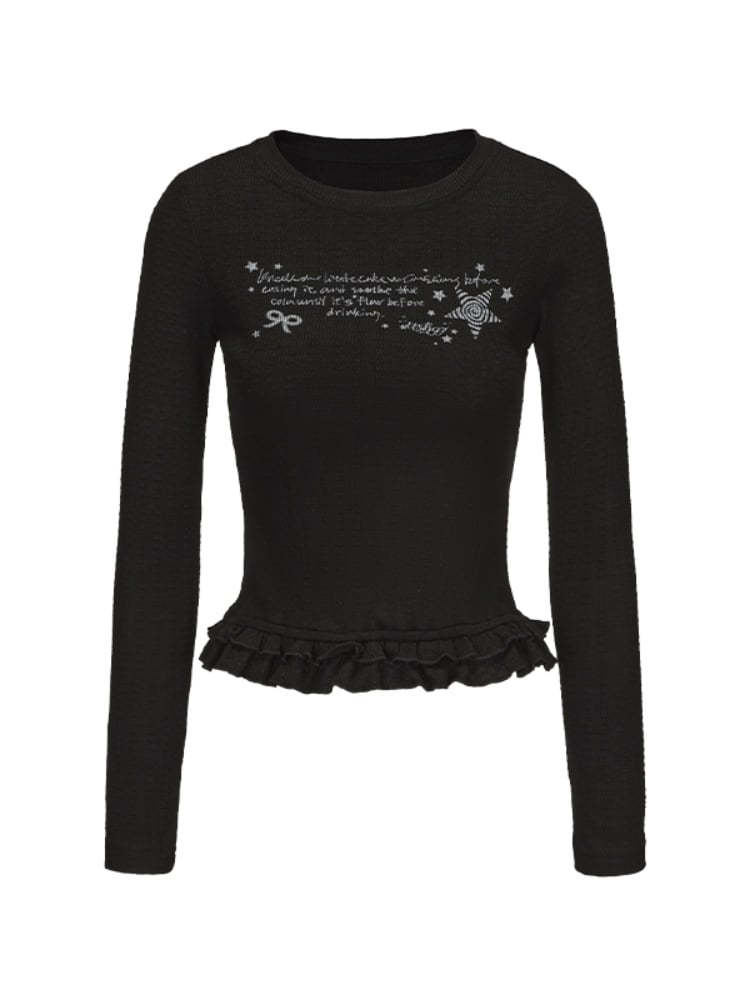 Schwarzes, eng anliegendes, bedrucktes Top mit Rundhalsausschnitt, gestuftem Rüschenbesatz