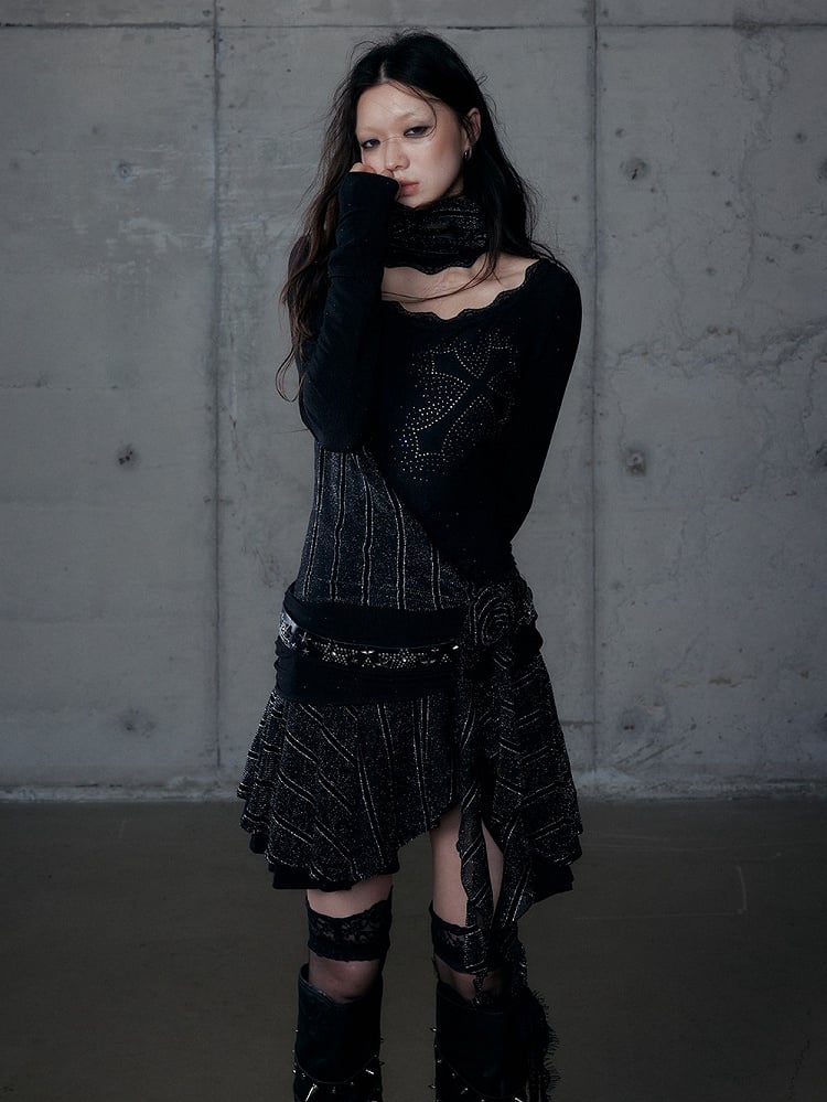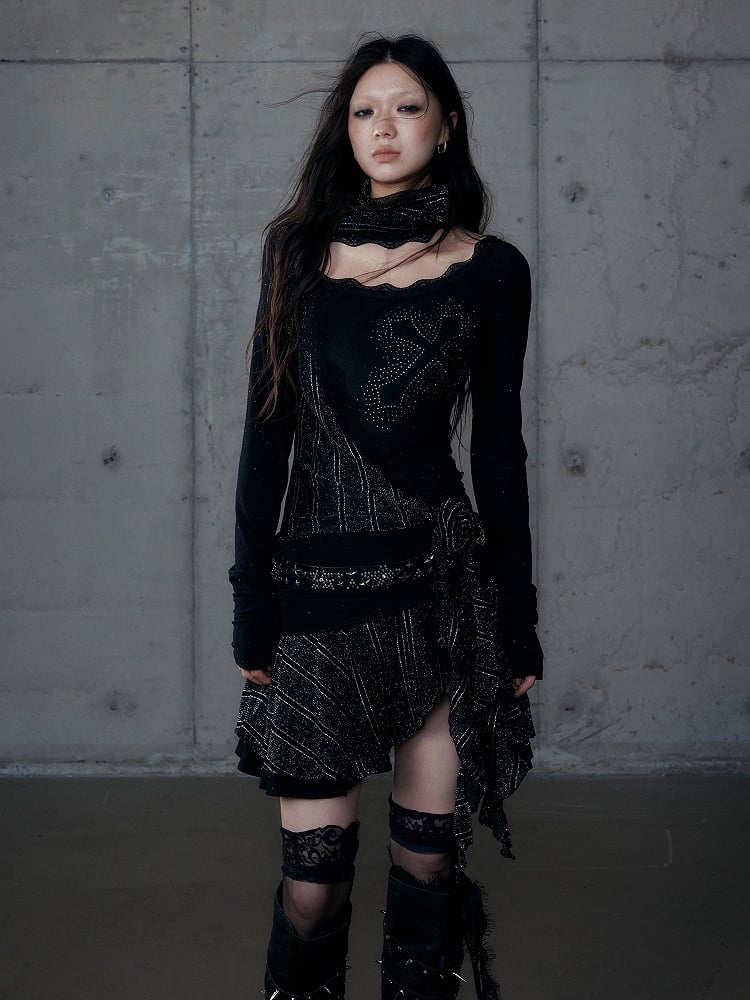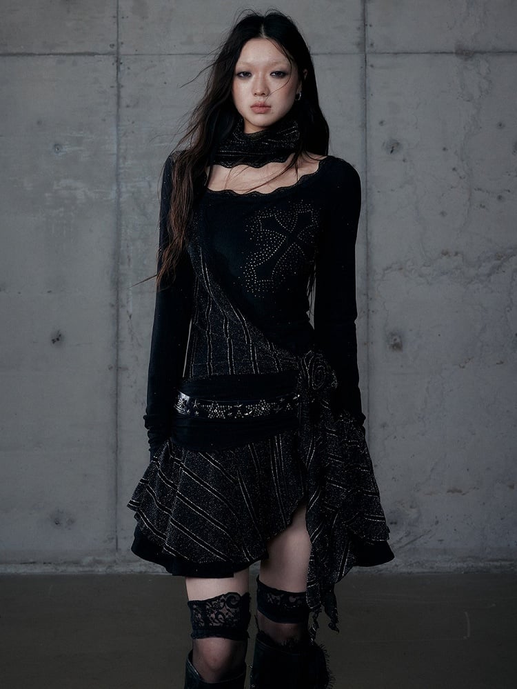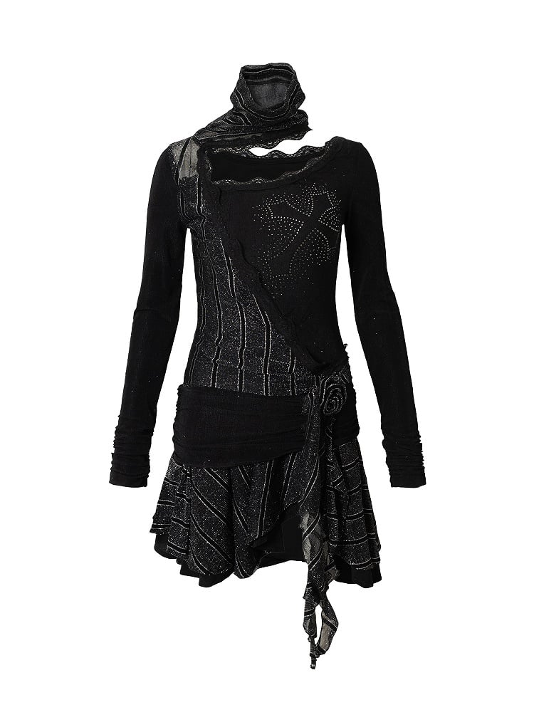 Schwarzes, gerüschtes, asymmetrisches Strass-Kreuz mit Kleidhalssaum