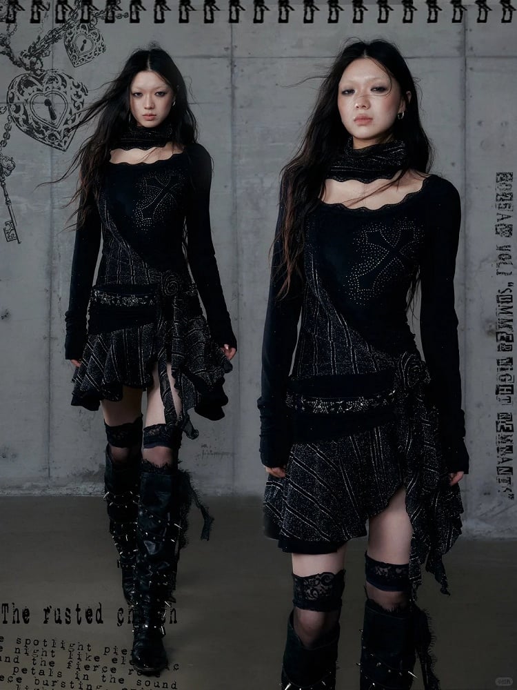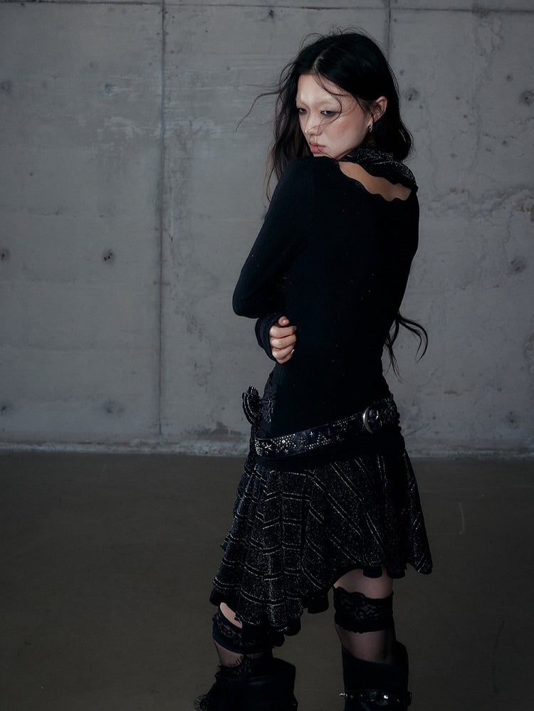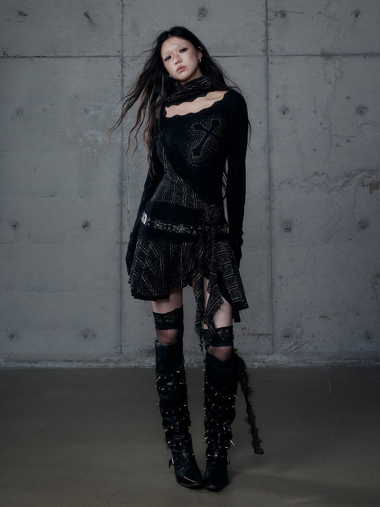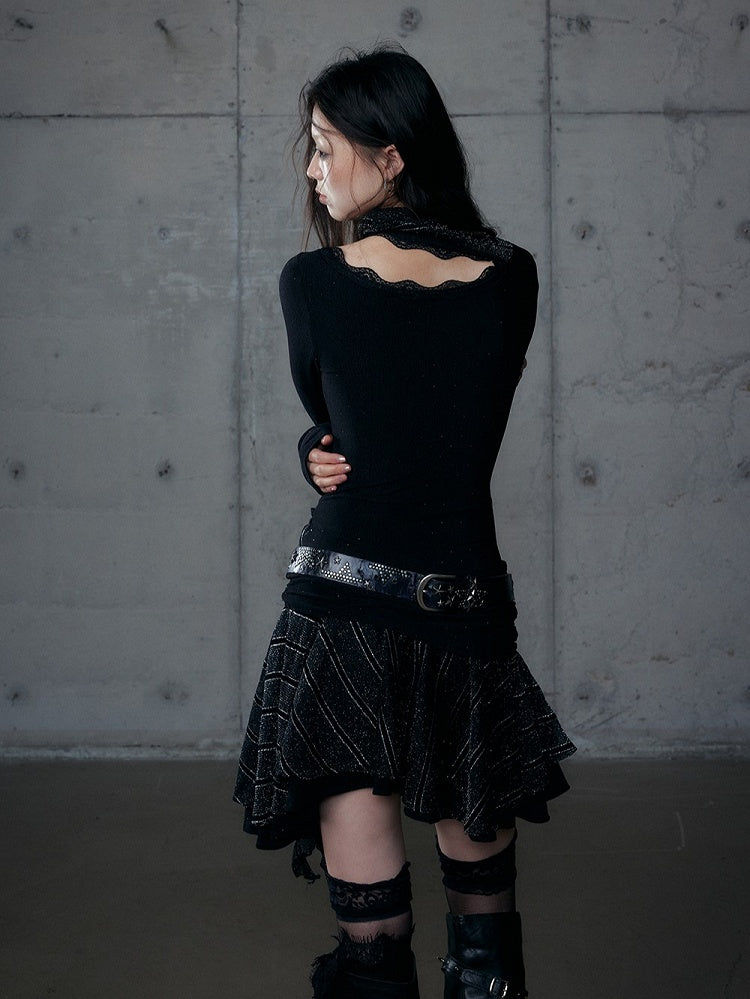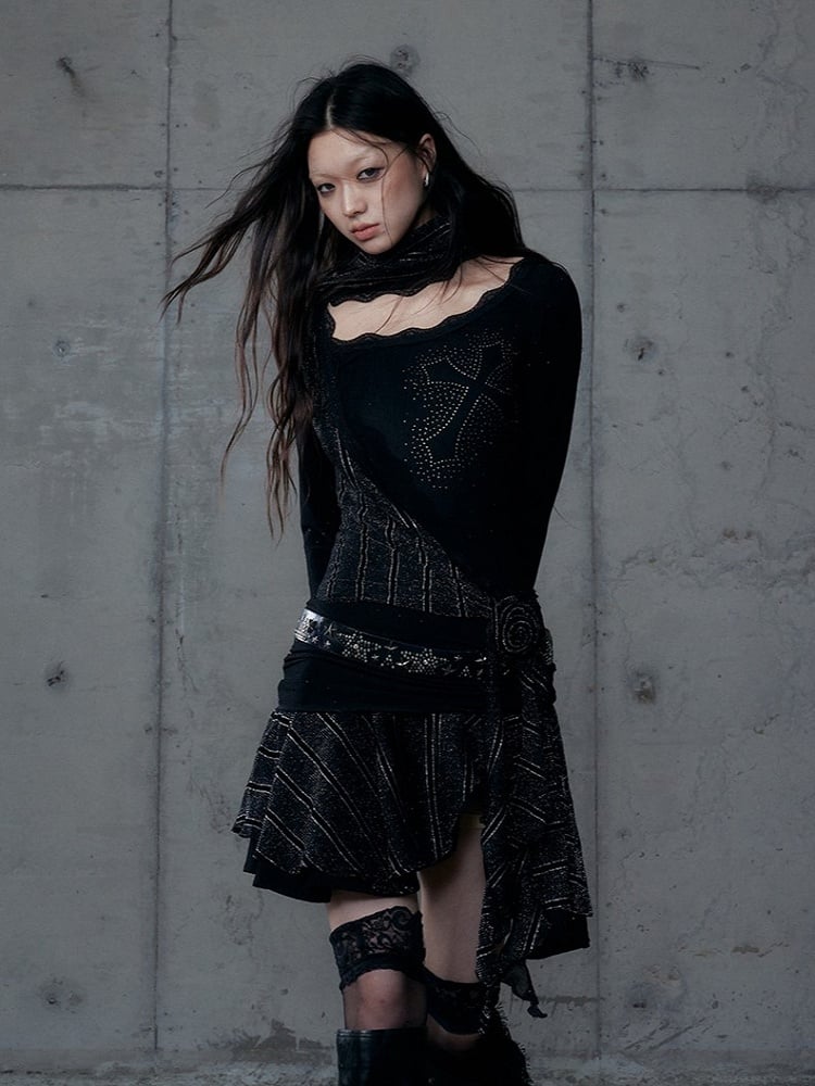 Schwarzes, gerüschtes, asymmetrisches Strass-Kreuz mit Kleidhalssaum