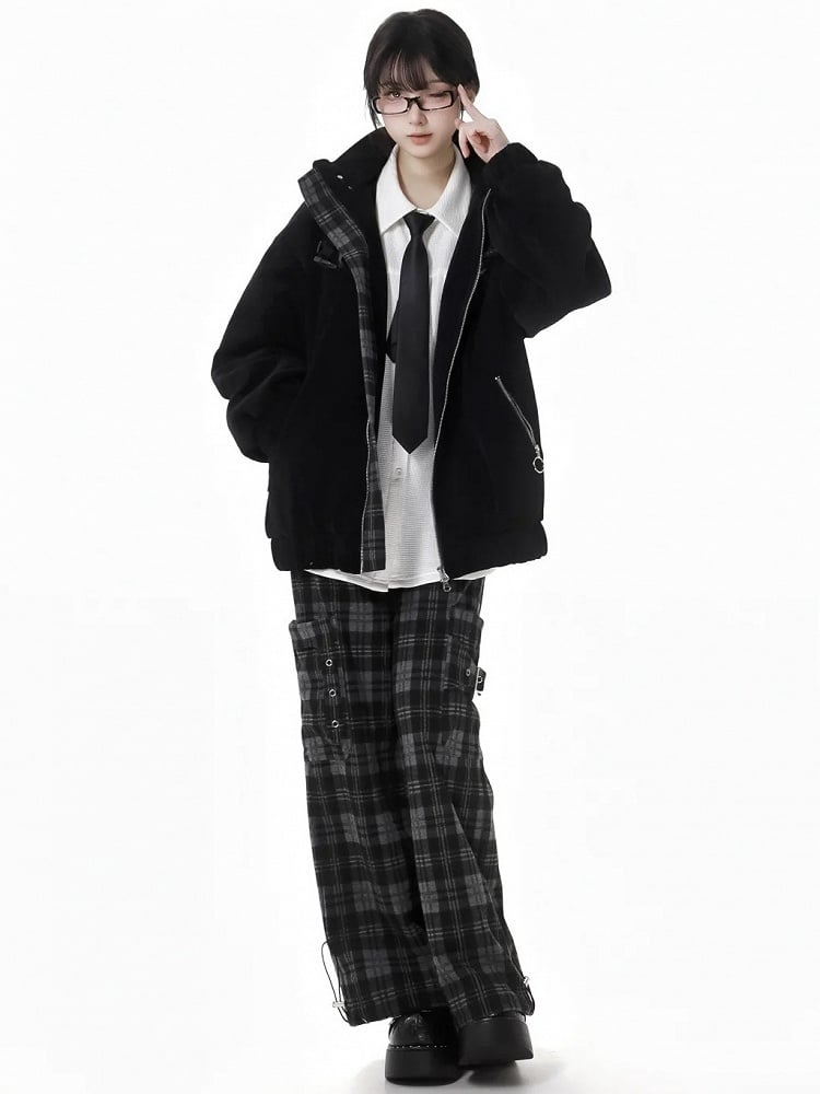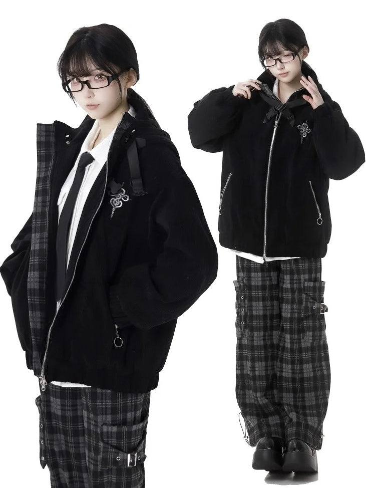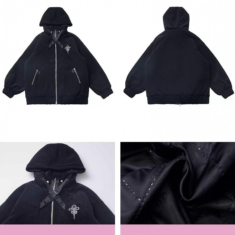Diese bezaubernde Jacke besticht durch ihr schwarzes Schlangenmuster mit gekreuzten Schnallenriemen und einer Kapuze. Bleiben Sie warm und stilvoll in diesem einzigartigen Stück.