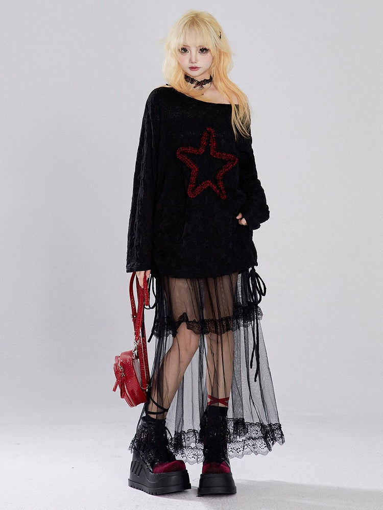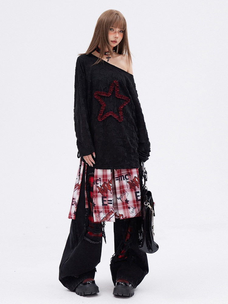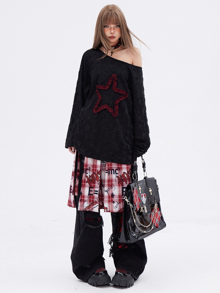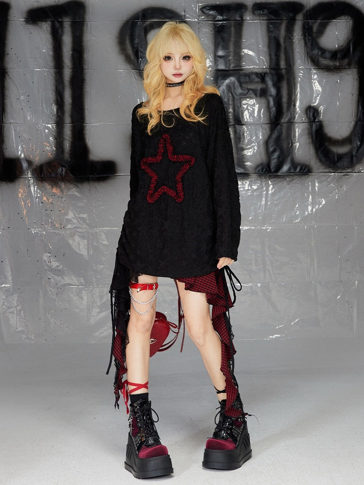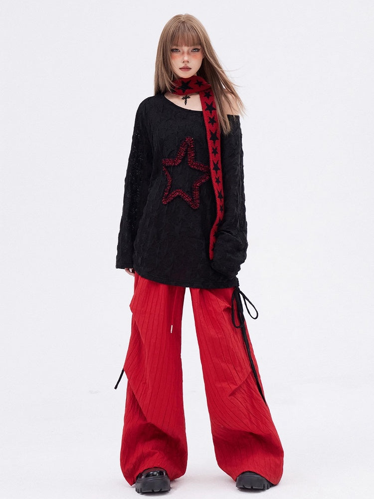 Schwarzes T-Shirt mit langen Ärmeln und Kordelzug und Stern