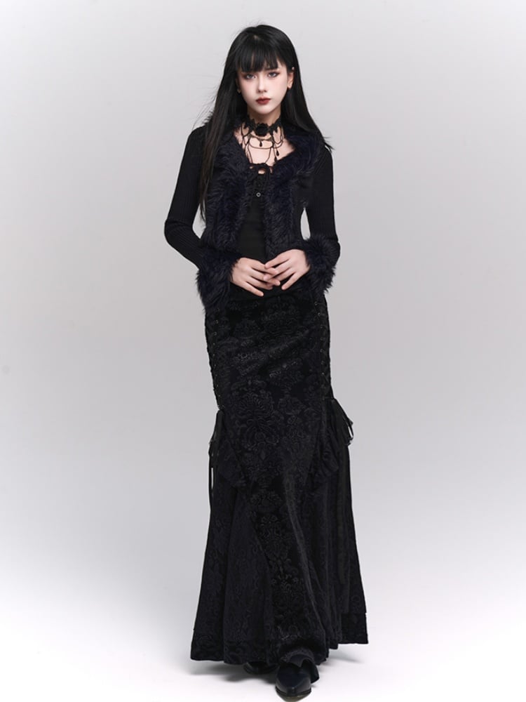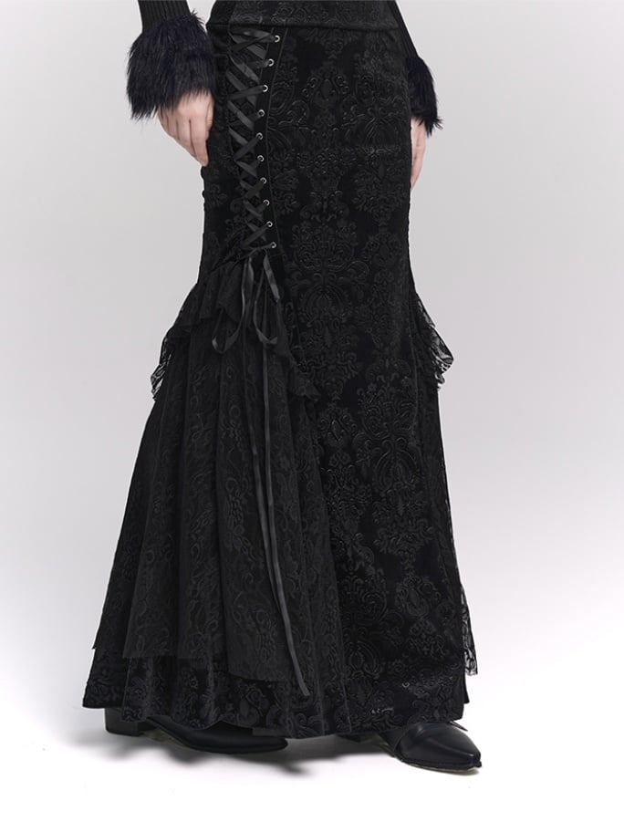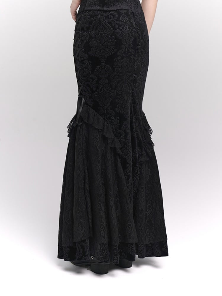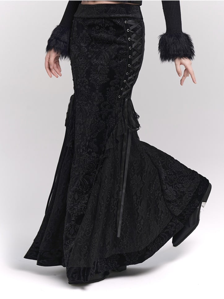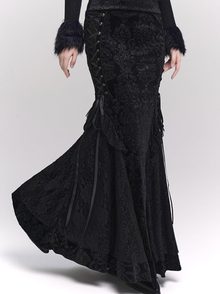 Schwarzer Meerjungfrauenrock aus Samt mit Schnürdetail an der Seite