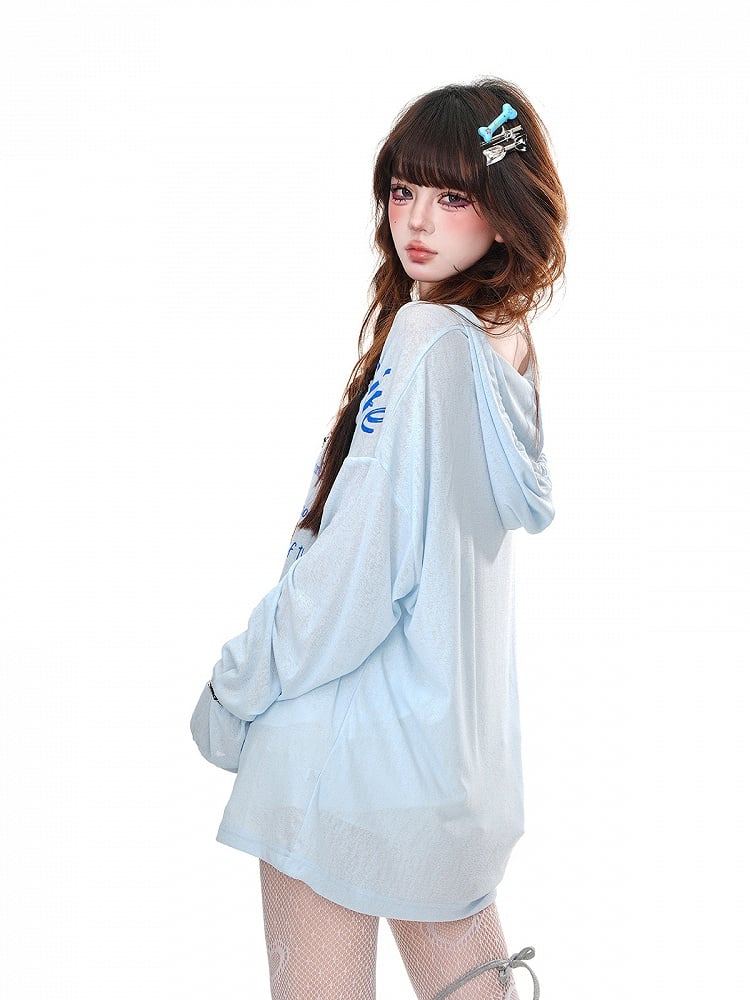 Schwarz/Weiß/Blau Halbtransparenter lockerer Hoodie mit V-Ausschnitt und Buchstaben